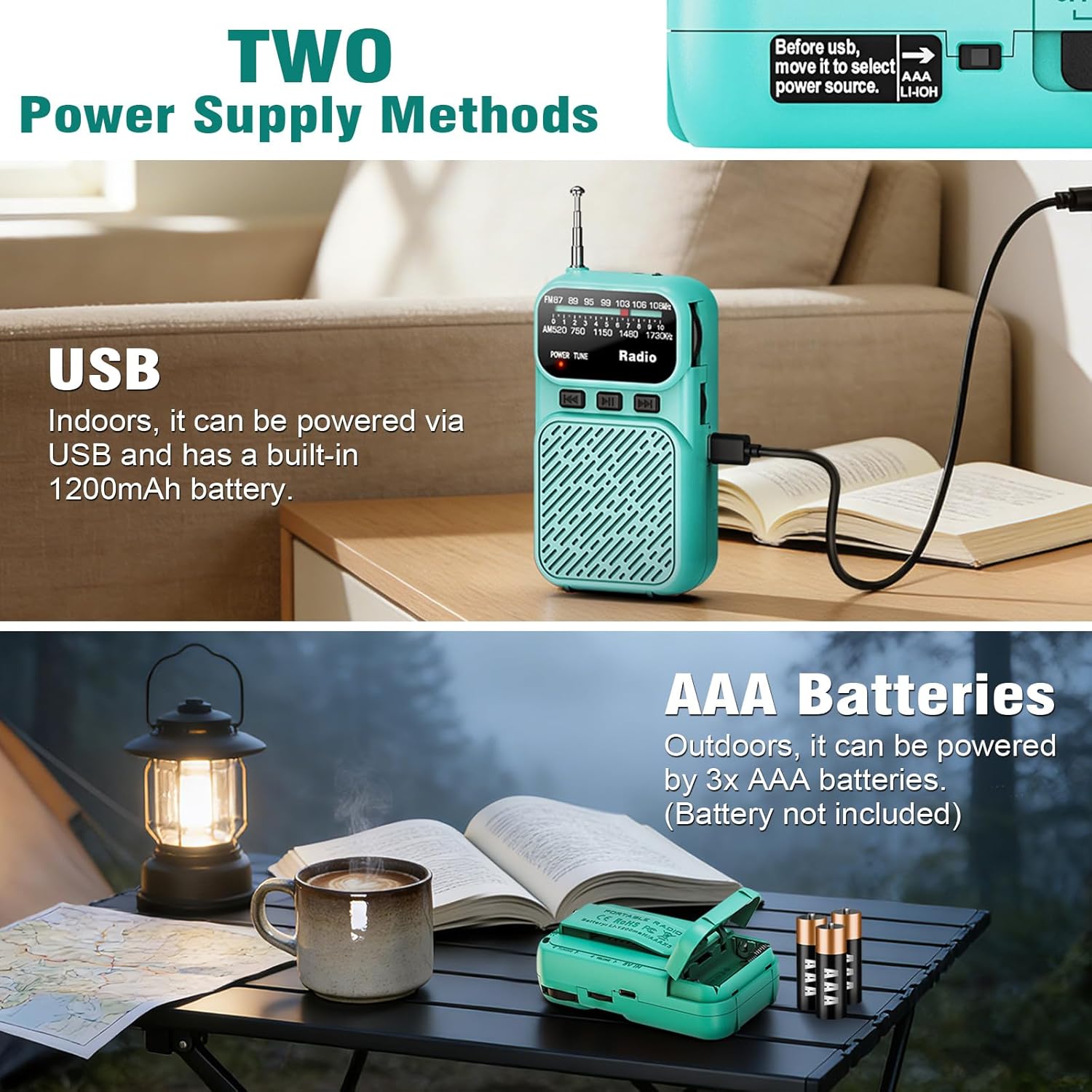 Dual Power Mode for Home and Emergency Use: The rechargeable radio features a built-in 1200mAh battery, easily charged using the included USB-C cable, making it perfect for daily use. For extended outdoor trips or unexpected situations, seamlessly switch to 3 AAA batteries (sold separately) to power through emergencies like power outages, hurricanes, or heavy storms. Whether camping, traveling, or exploring the great outdoors, it’s your reliable companion.