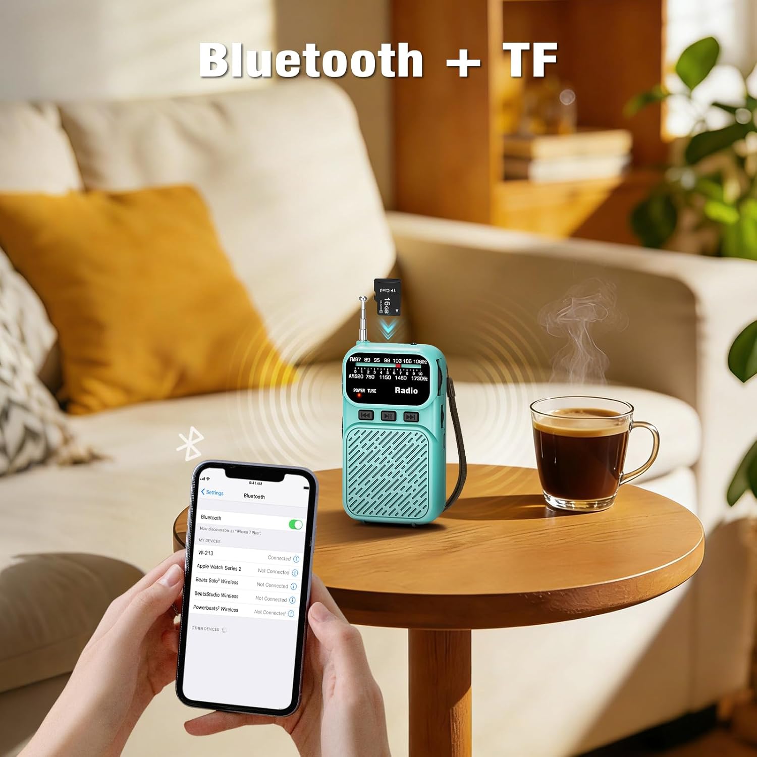 Built-in Bluetooth 5.0 connects to phones/tablets quickly. Also supports TF card playback for your own music library.