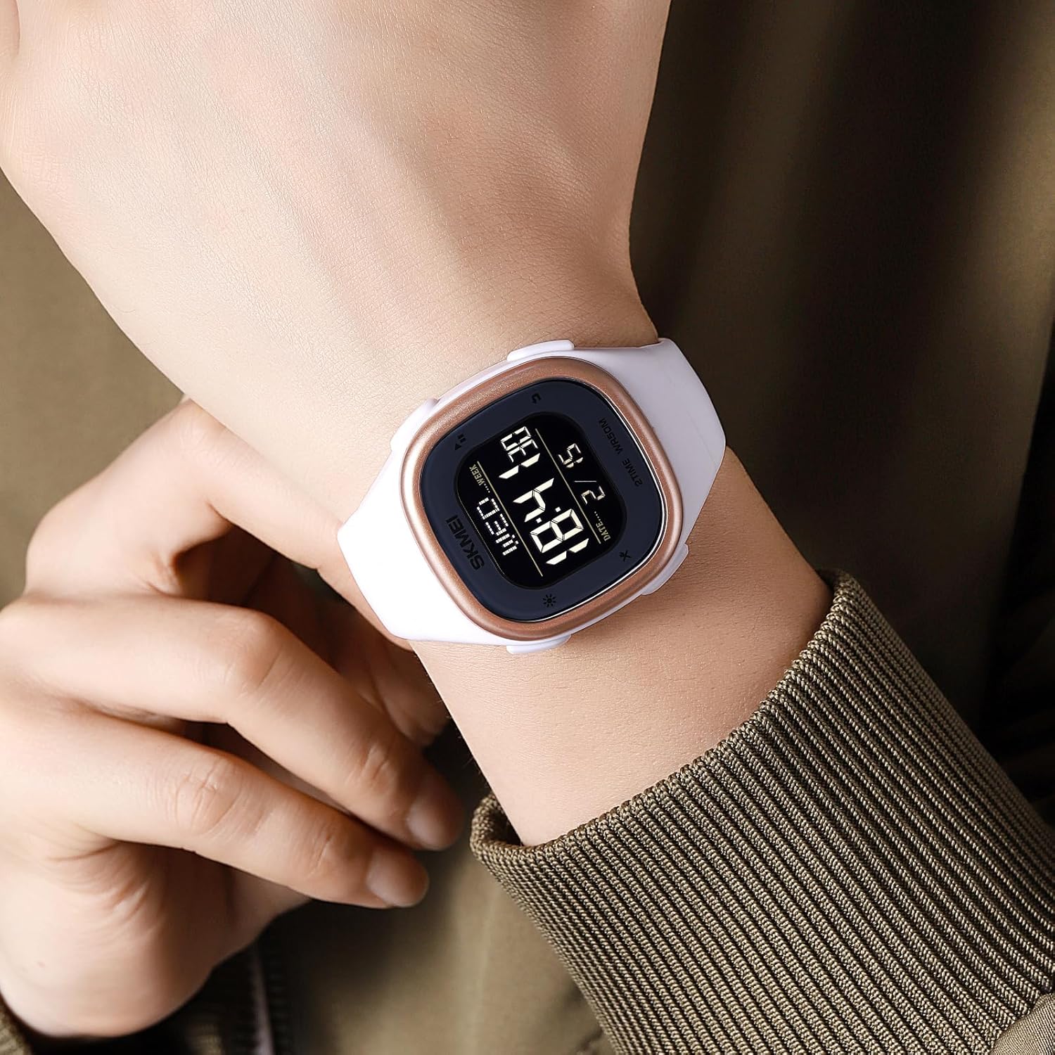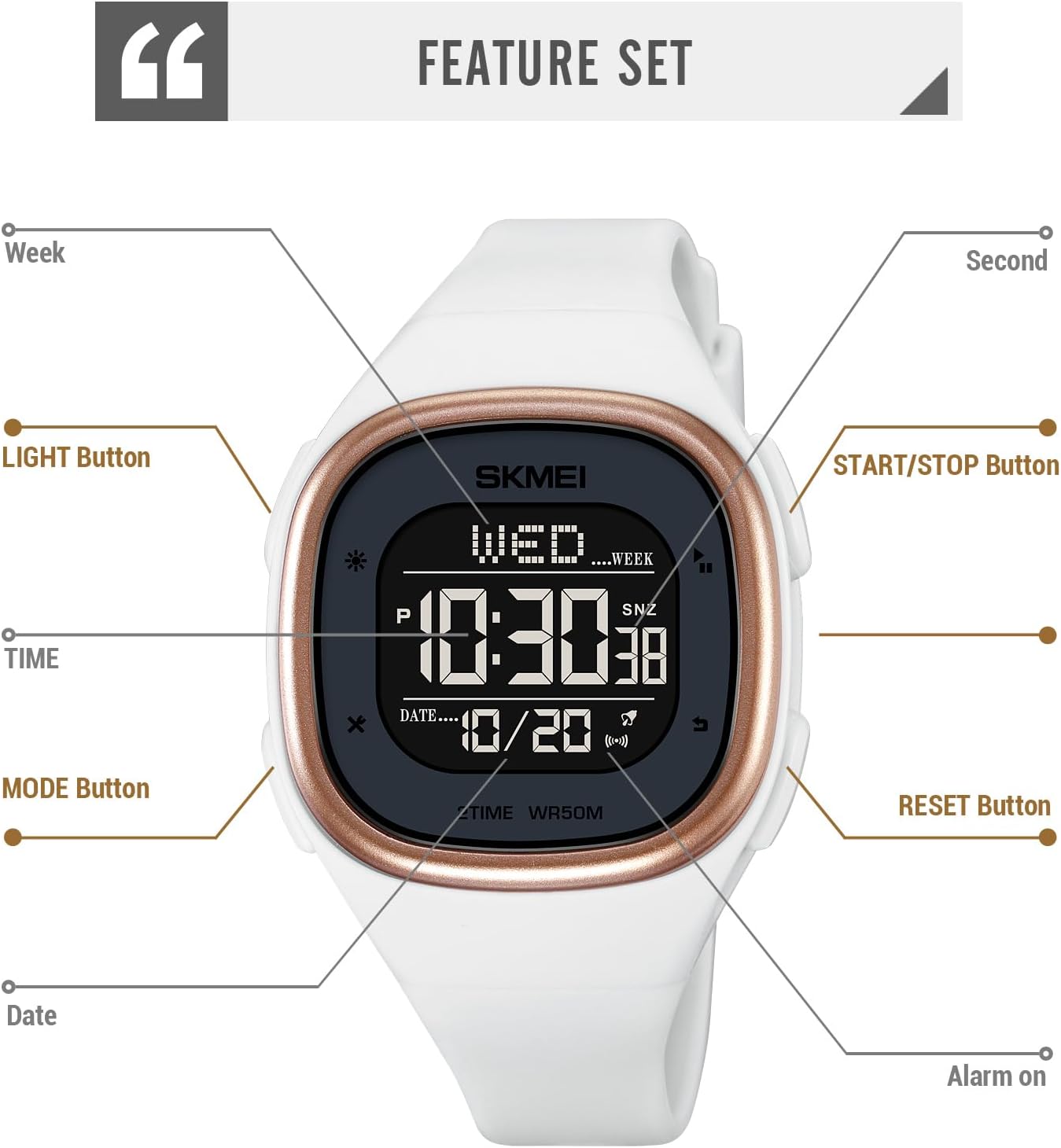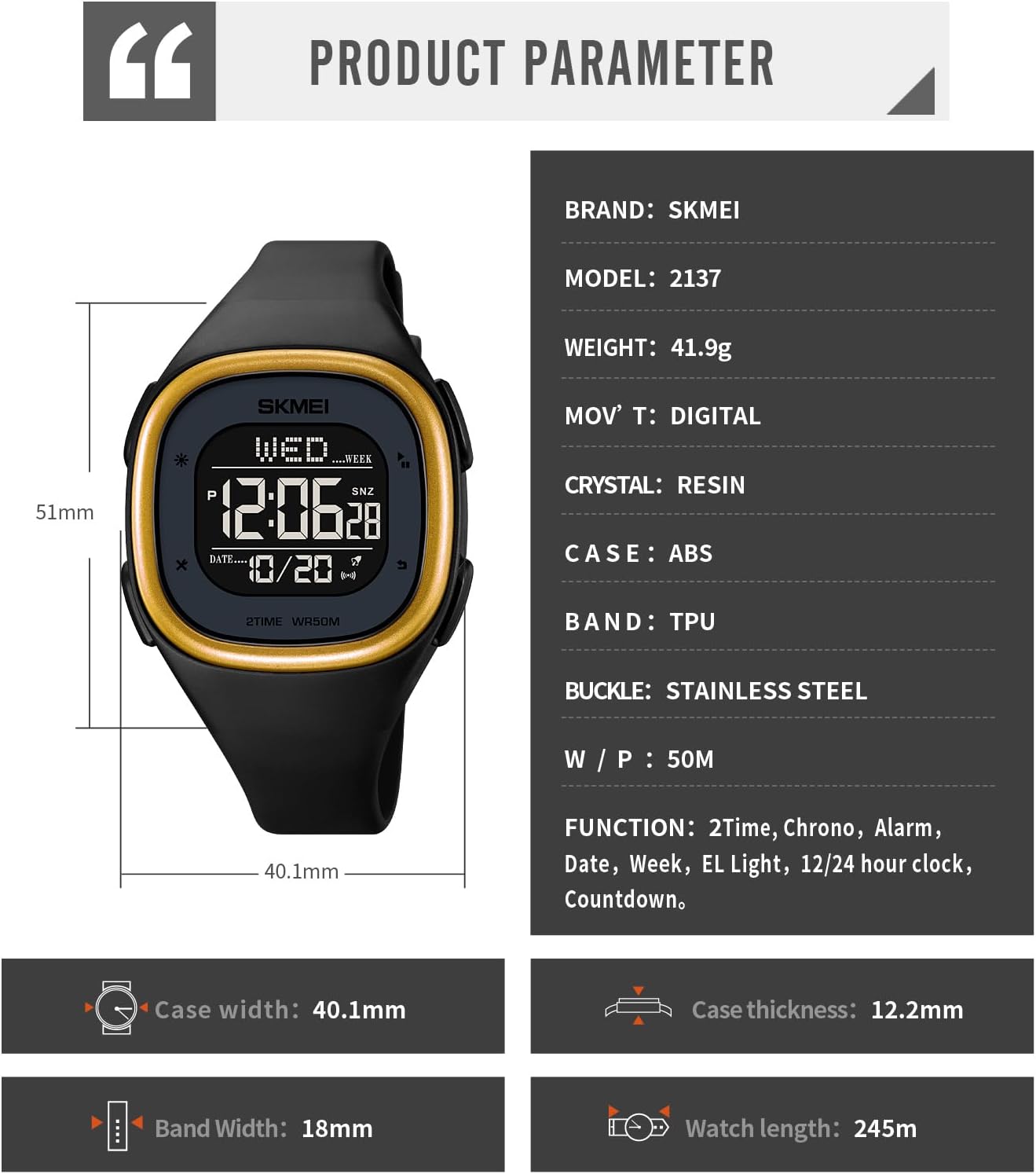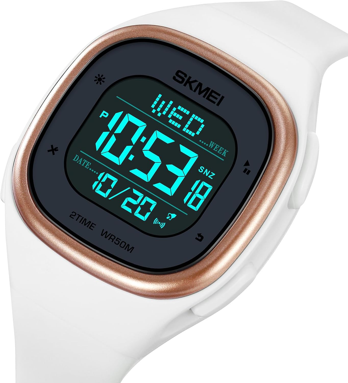 Unique dual time display and square digital display will surely turn heads, while enabling