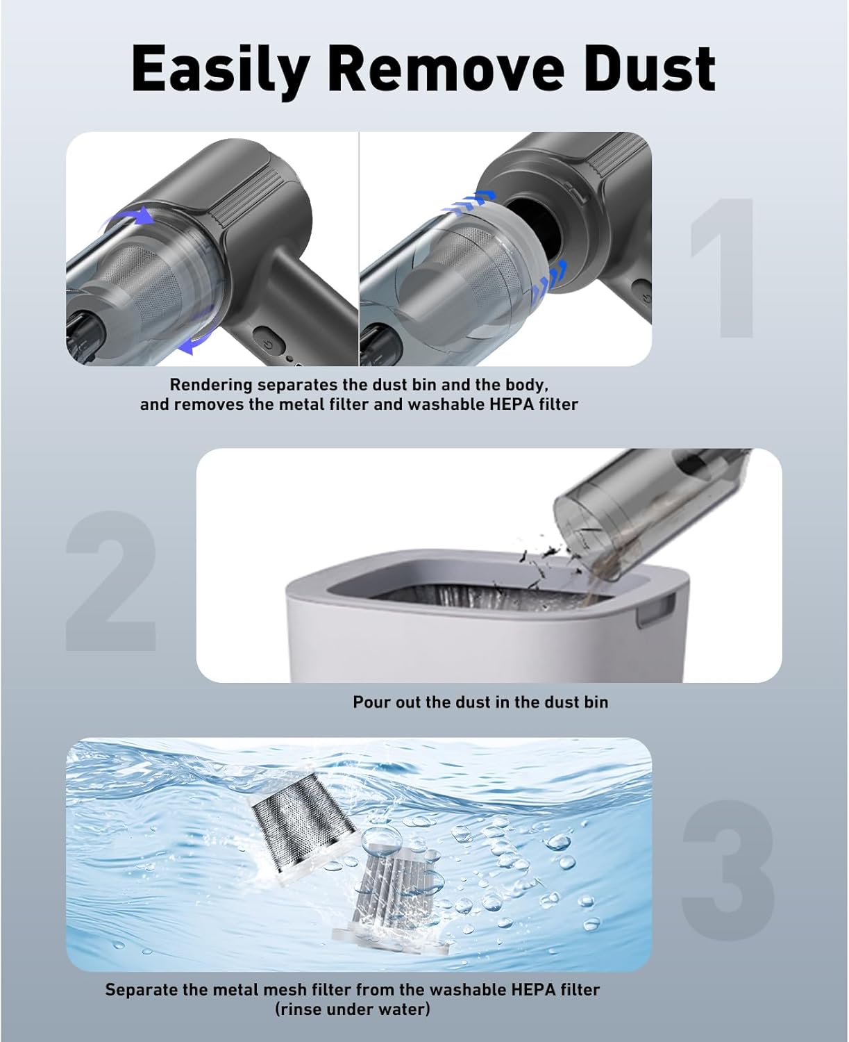 【METAL FILTER & HEPA FILTER】With our HEPA+metal filtration combo capturing 99.97% of particles down to 0.3 microns. Ideal for homes with pets or allergy sufferers.The high efficiency filter can also be easily disassembled, and can be reused by simple cleaning with water.