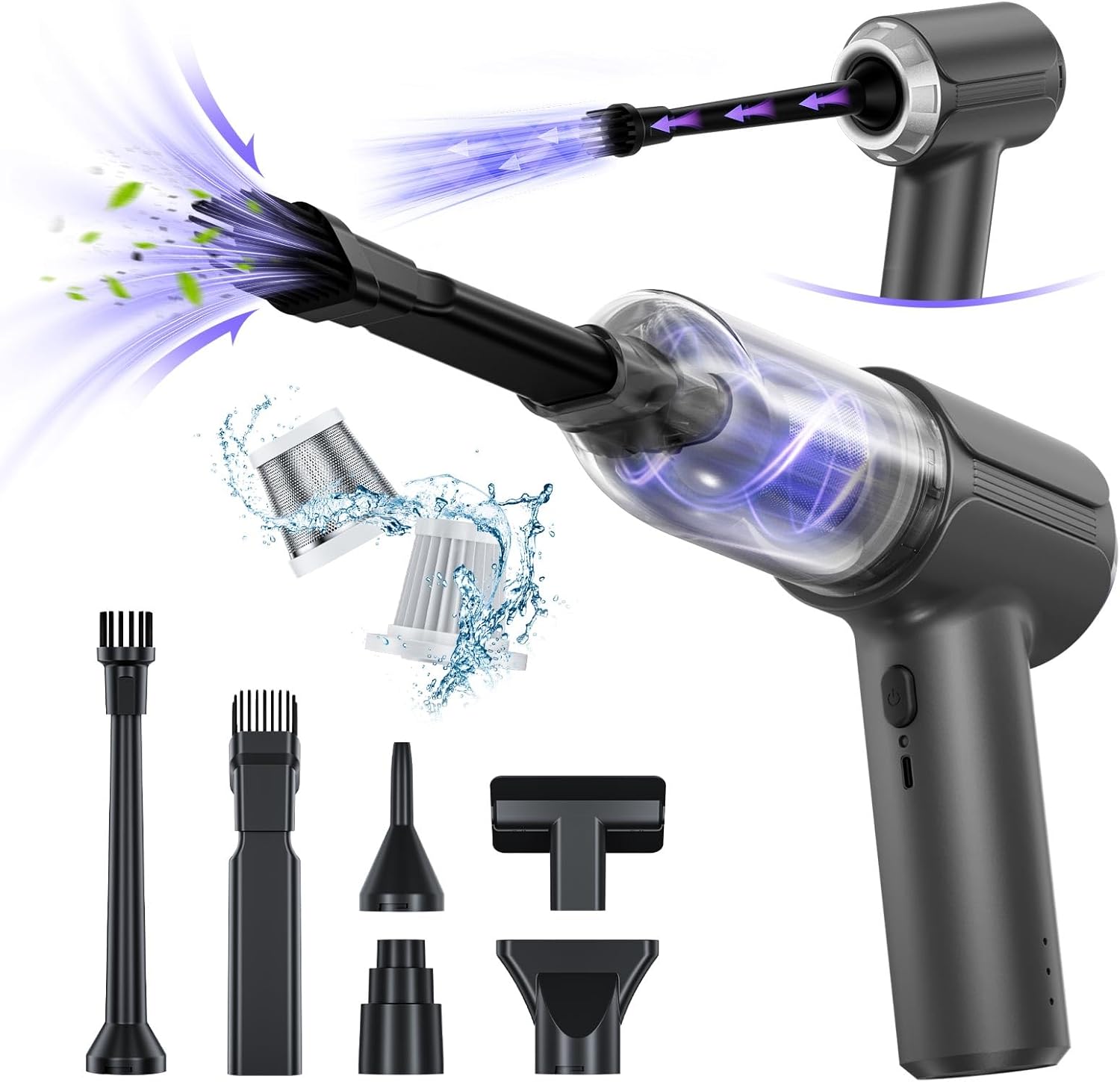 【4-IN-1 Car Vacuum Cleaner】Transform your cleaning routine with suction, blowing, inflation, and vacuum compression modes – all in one handheld device. Effortlessly tackle crumbs in car seats, pet hair on sofas, or dust in keyboard crevices. Need to pack for a trip? Use vacuum compression to save 50% luggage space. Perfect for road trips, family picnics, or quick home cleanups.
