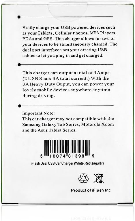 Package Includes:- One(1) iFlash Dual Port Car Charger
