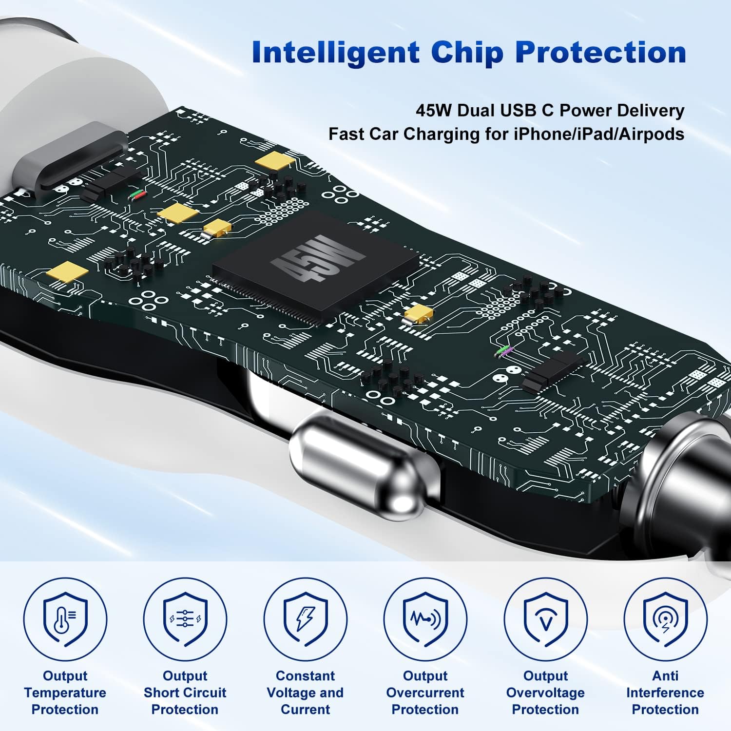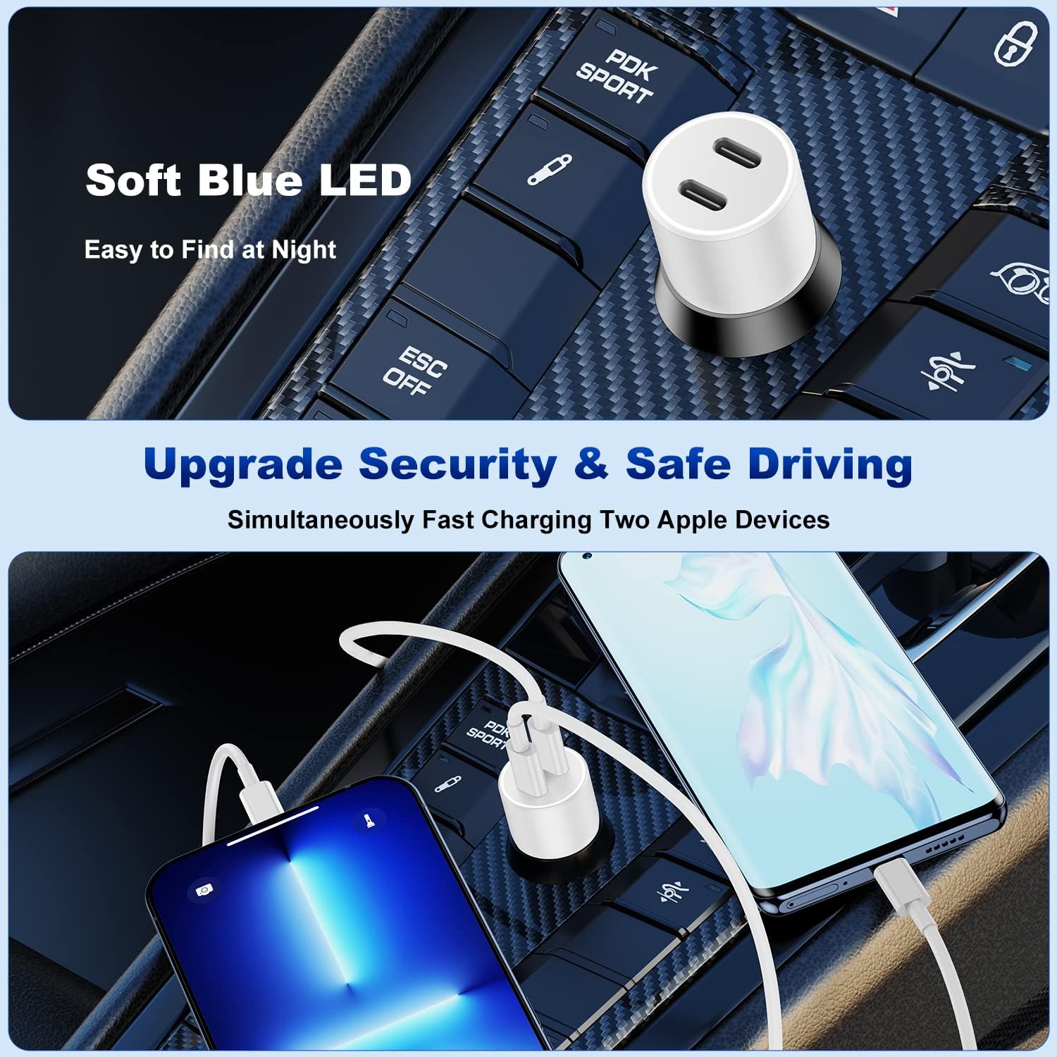 【Safety Efficient & Fast Charging]】: iPhone USB C Car Charger automatically recognizes dual devices, frees up more space, and provides you with a comfortable driving experience. Built-in multi-protection system, avoiding from over-voltage, over-charge, over-heat, etc., charge your iPhone/iPad device fast, safely and steadily.