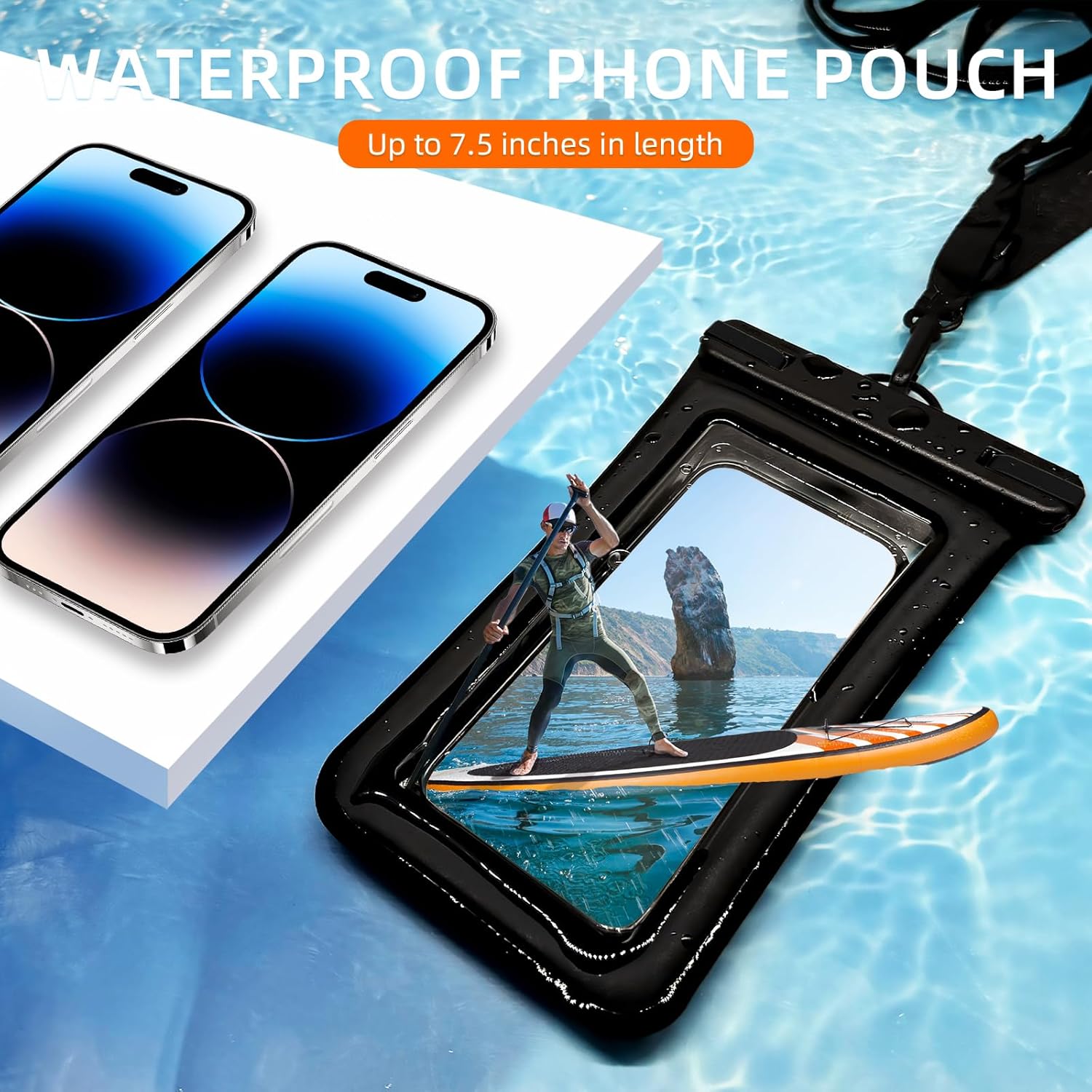 IPX8 RATING WATERPROOF: This Floating Waterproof Phone Pouch is certified to have an IPX8 waterproof rating that keeps your phone dry even when submerged in water. Whether you are planning a beach vacation, kayaking, or just want to protect your phone from accidental leaks, this floating waterproof phone case for swimming is a must-have for travel