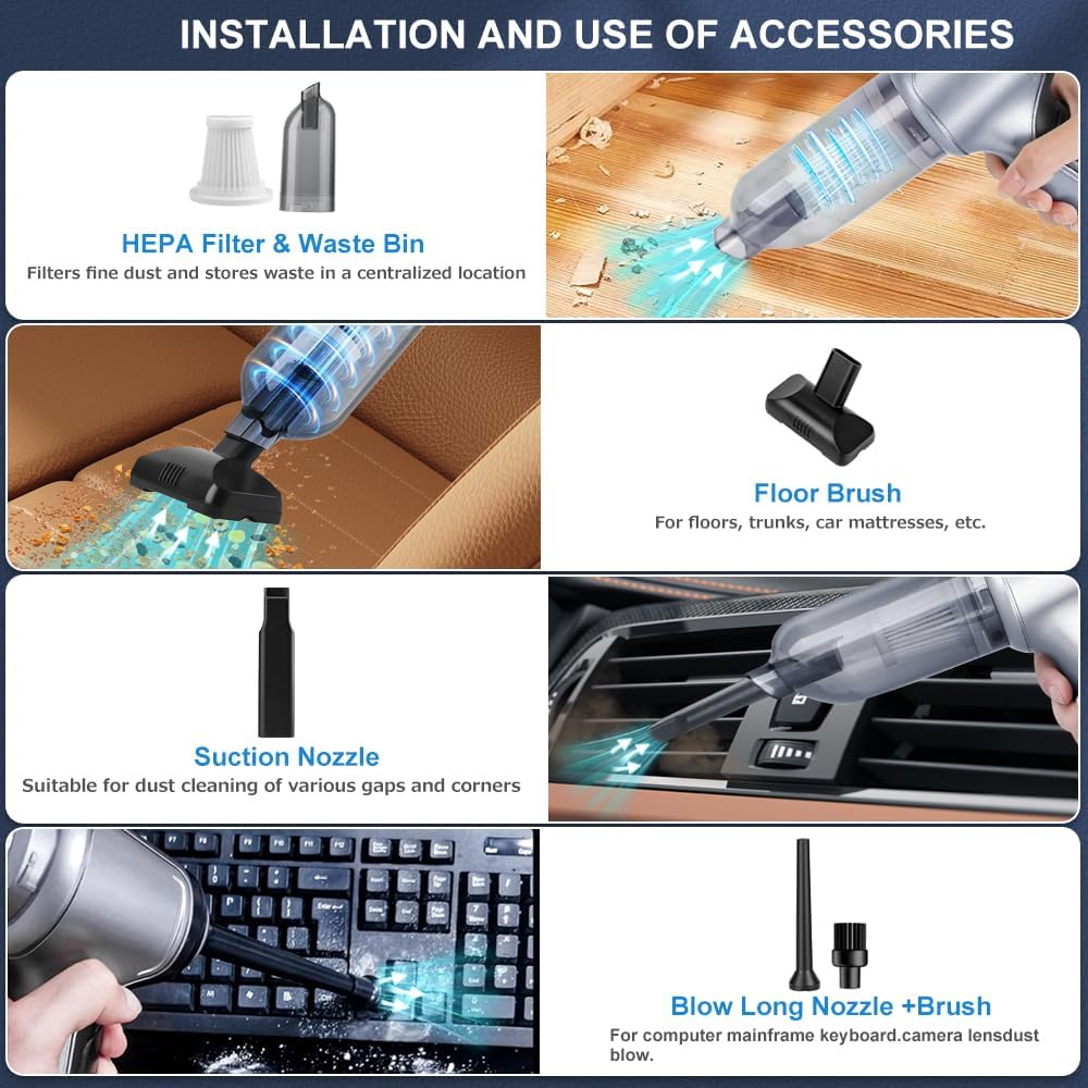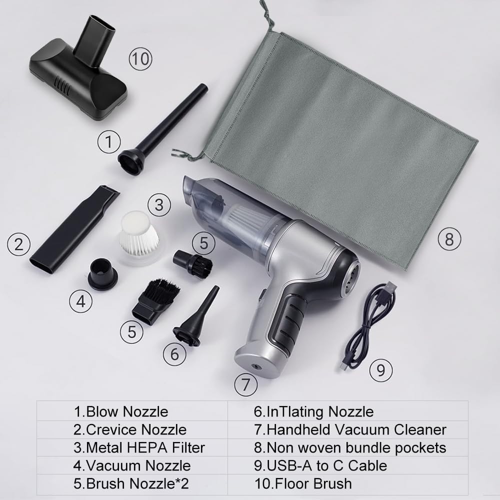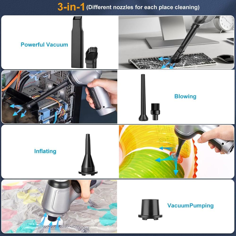 【3-in-1 Multifunctional Mini Vacuum Cleanerr】This mini car vacuum has 3 mode of blowing, sucking and inflating.With its brush and nozzle attachments, it effortlessly tackles crumbs, pet hair, and dust in carpets, upholstery, narrow spaces, and crevices like computer keyboards and mainframes. Additionally, it serves as a BBQ fan and a tire inflator, adding versatility to its capabilities. (CAN’T ABSORB WATER OR LIQUID)