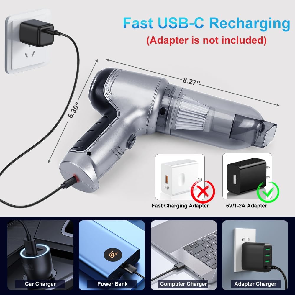 【Rechargeable Battery & USB-C Fast Charging】The Electric Vacuum Cleaner has a built-in 4000mAh battery with a fast charging port. it can be can quickly fully charge in 3-4 hours and can be used for 20-40 minutes, depending on suction level you choose.Comes with a USB-C charging cable, that can be used to charge the vacuum in a USB slot anywhere in the car or at home.Tips : when charging, the red light of the charging line is on; when the battery is fully charged, the indicator light of the charging line is green ( 5V/2A adapter is recommended, but not included)