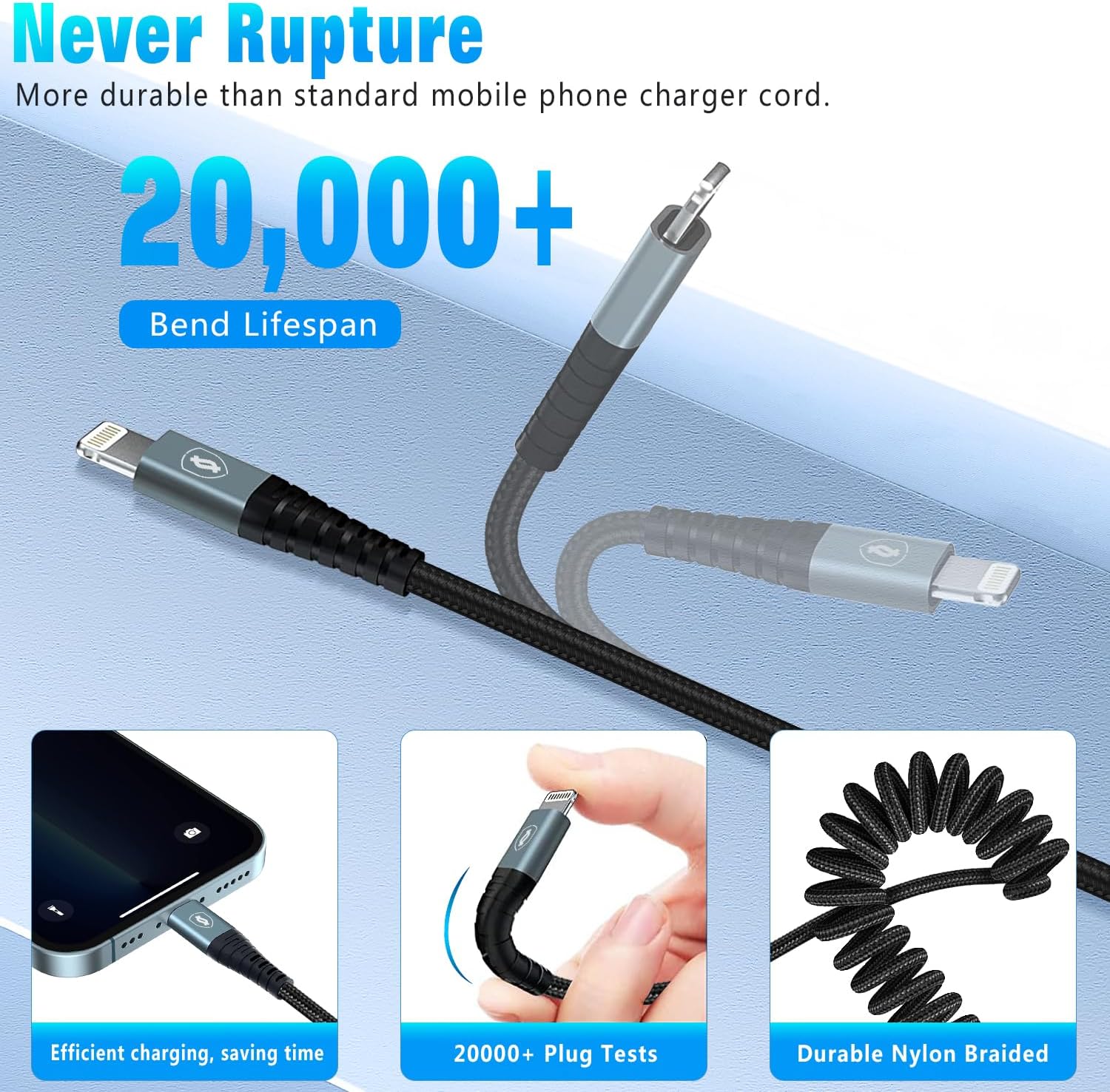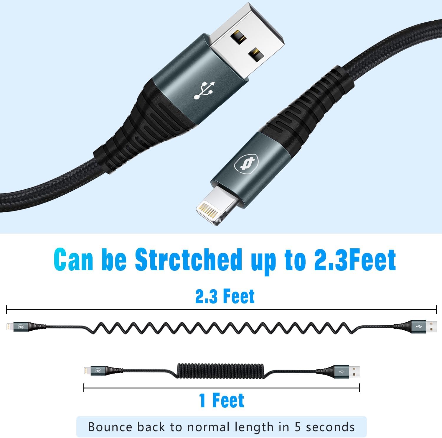 【Coiled Lightning Cable Made for Car】 Specially manufactured for the car disc-shaped lightning cable, designed in the shape of a spring, retractable at any time to adjust easy to carry and use, not easy to knot, save space in the car, will not cause clutter and trouble.