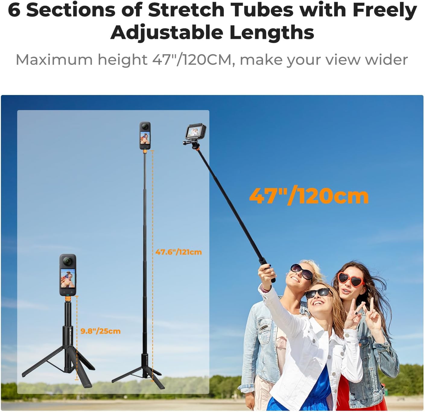Invisible Selfie Stick: Extension selfie stick can make the selfie stick traces disappear automatically, presenting a stunning follow-through effect. Note: To achieve this, keep the tripod legs closed and the stick vertical with the camera. And Not recommended for use in bumpy conditions.