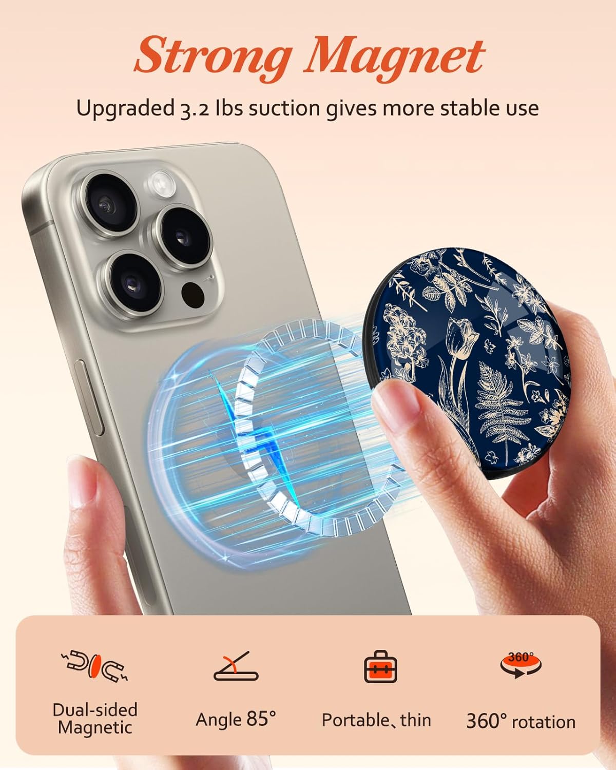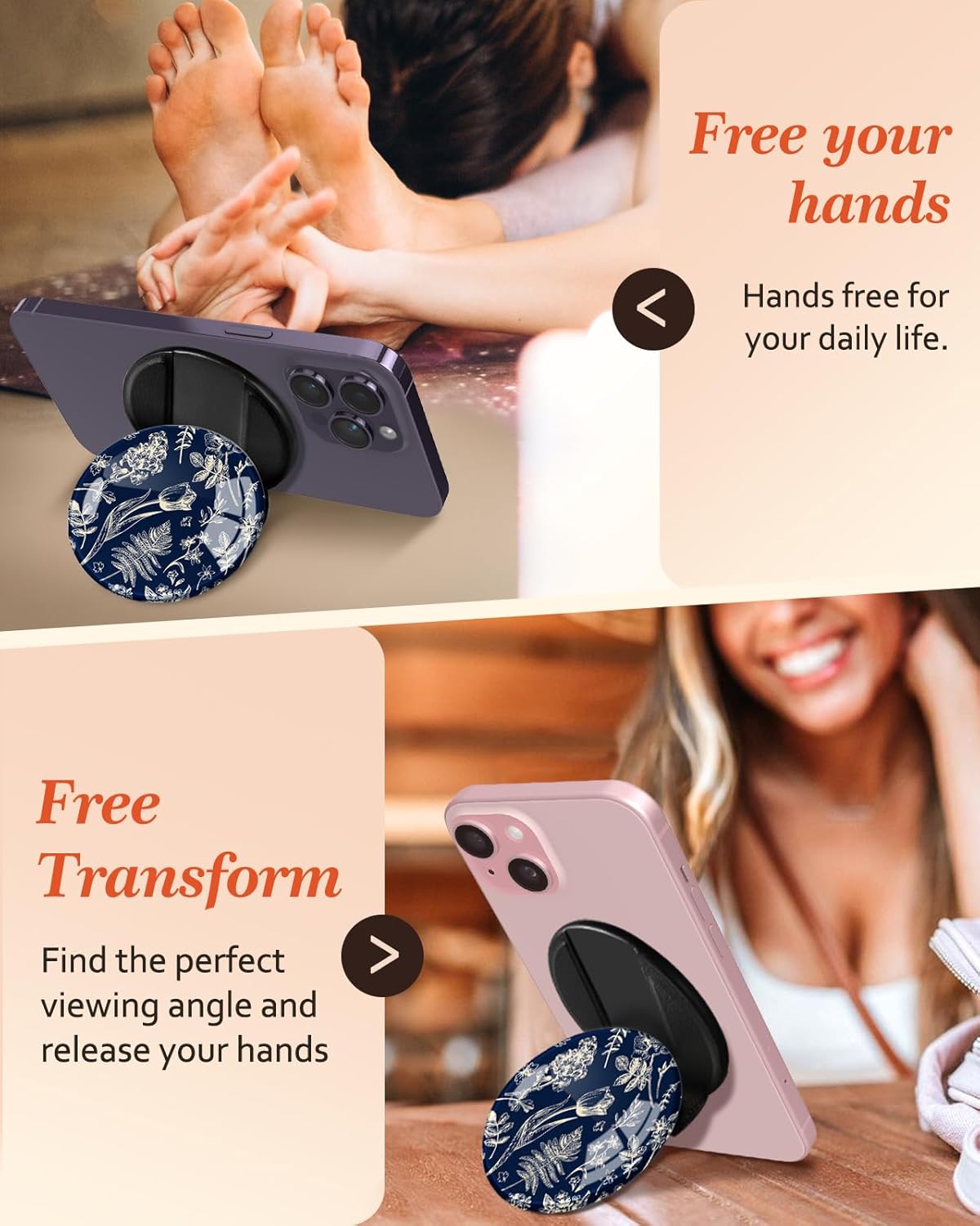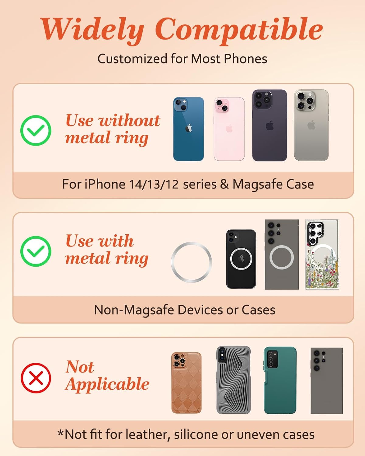 Wide Compatibility: This magnet phone grip stand holder is compatible with iPhone 12/13/14/15/16 phone series, it is also with other cell phones with magnet plate or for mag safe cases. Note: It cannot be used for cases without magnetic rings and without magnetic cell phones