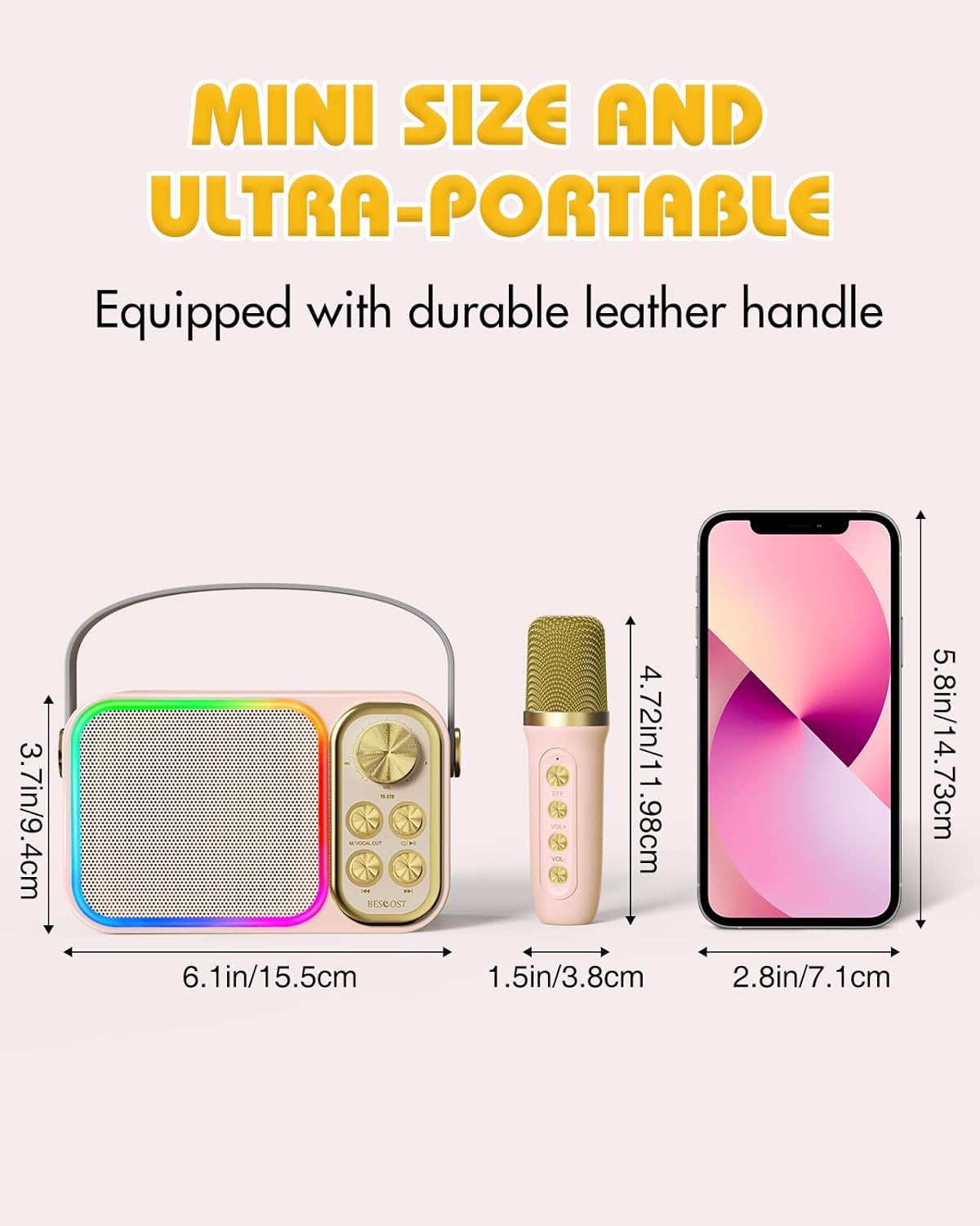 【PORTABLE AND EFFORTLESS TO USE】This cute karaoke machine not only adopts the latest bluetooth 5.0 chip, but also supports tf card, flash usb and aux-in connection. its compact nature makes it ideal for impromptu karaoke, letting you sing anytime, anywhere, and effortlessly replicating the excitement of a karaoke bar.