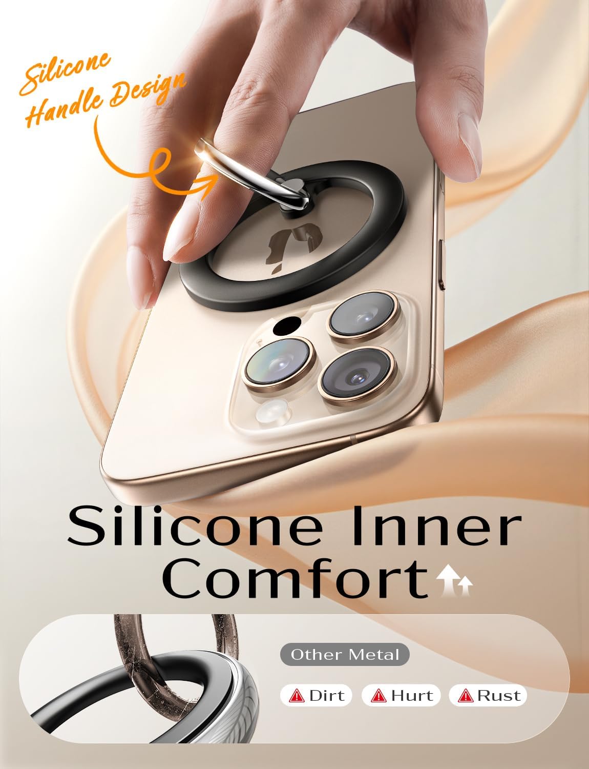 SILKY SKIN-FRIENDLY: LISEN for MagSafe ring features a silicone ring lining design, ensures comfortable finger grip without any discomfort or pain, compares to other full metal rings; The holder provides comfortable matte texture, and silicone design does 0 harm to back of your phone