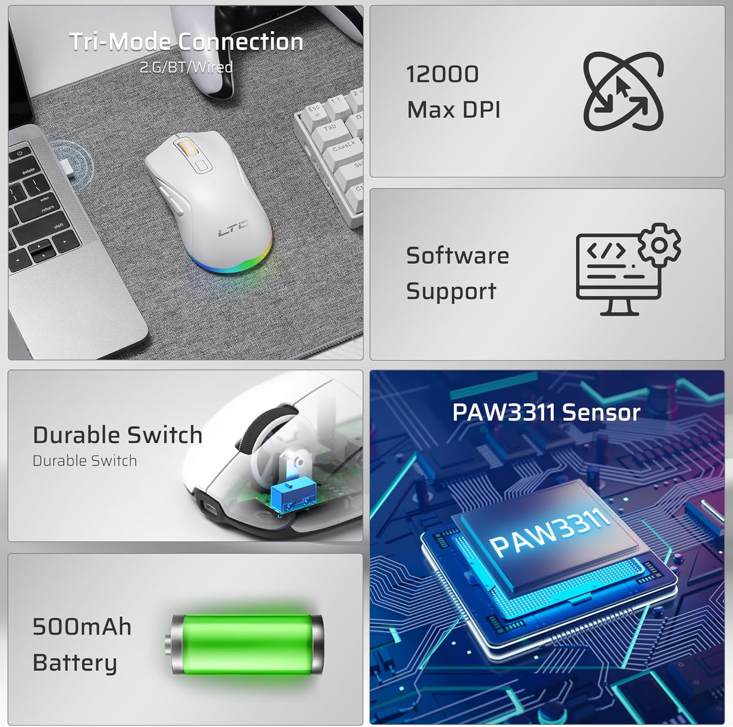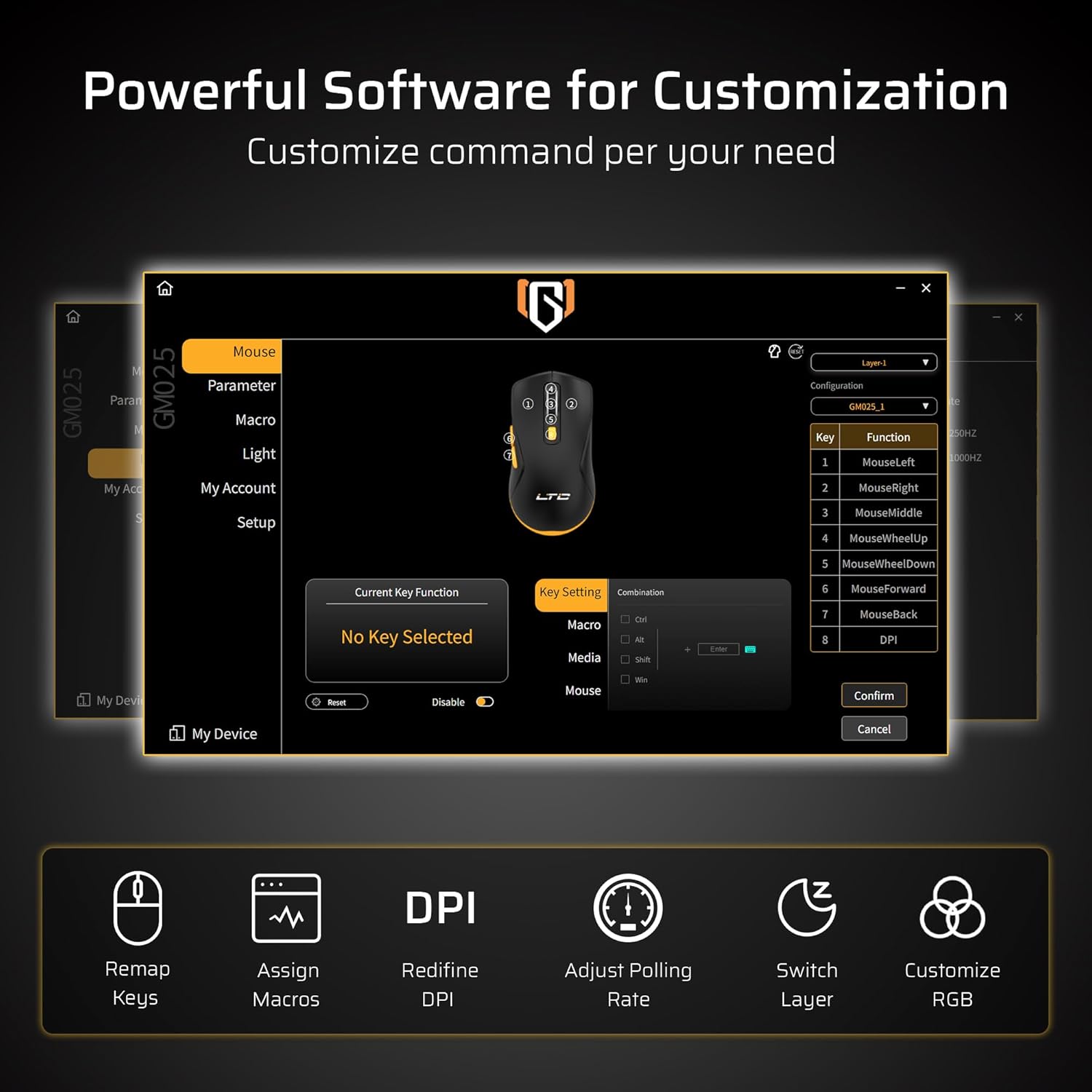 Pro Software Support — Assign Macros, remap key functions, redefine 6-Step DPI, and fine-tune polling rate with the powerful LTC driver. Perfect for gamers and professionals seeking a tailored experience