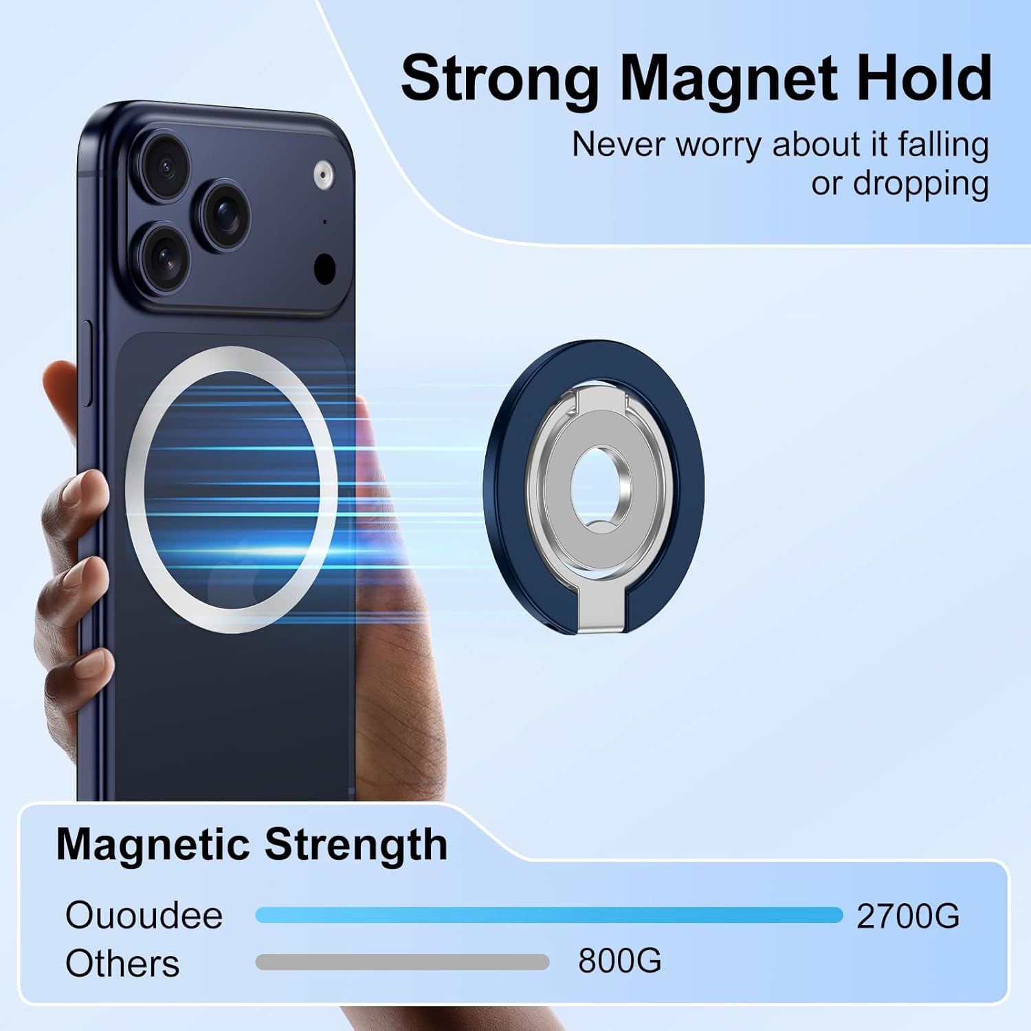 【Ultra-Strong Magnetic】The MagSafe grip phone ring holder magnet is made of N55 neodymium magnet, which has Ultra-Strong magnetic. When it is close to the phone, It can be firmly attached to the back of the mobile phone, not easy to fall off, and convenient for quick installation and disassembly. You can also use the thin metal rings(provide), which can increase the magnetic force several times.