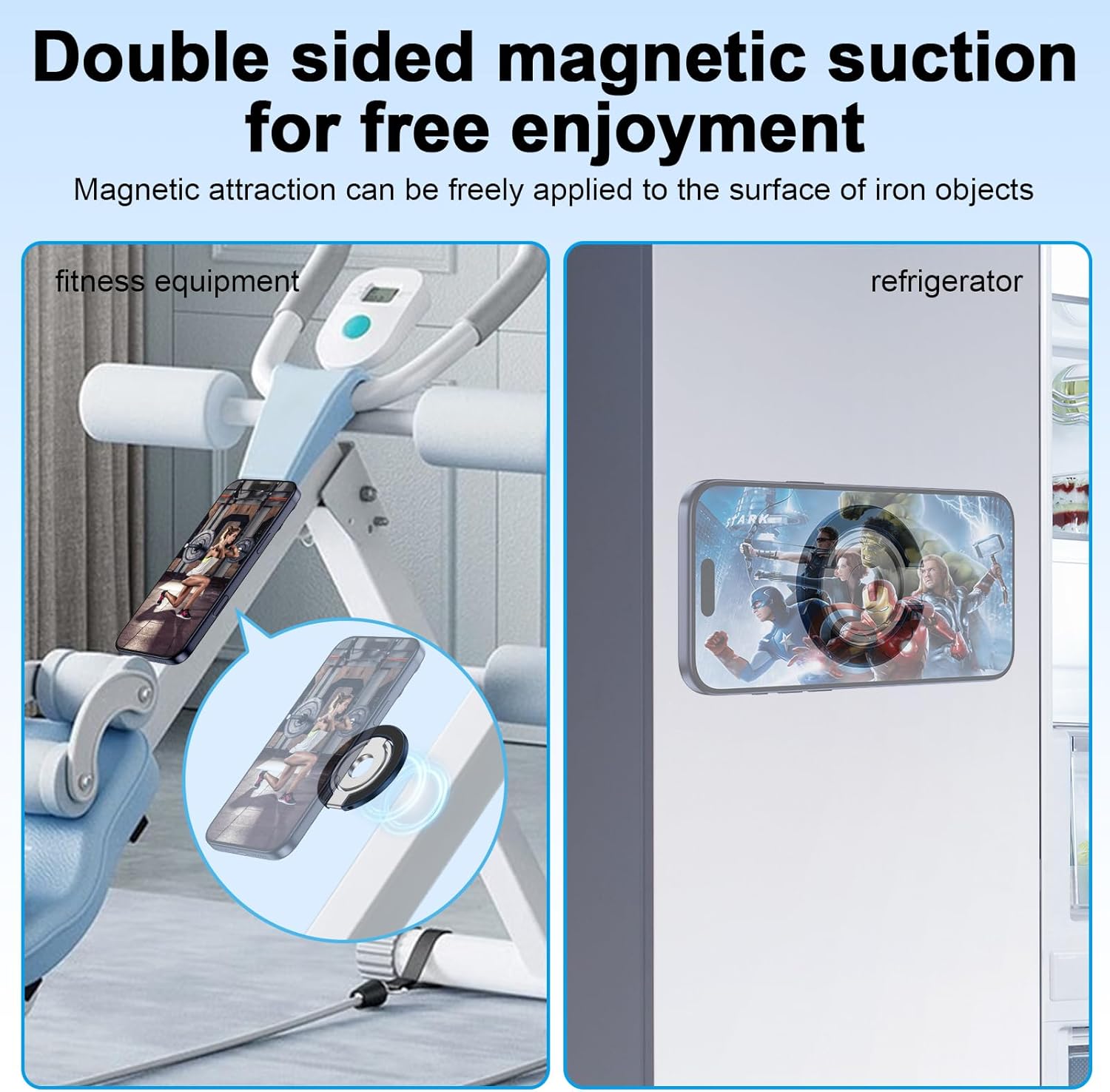 【Dual-Side Magnetic】The Magnetic phone finger grip holder uses nnovative dual-side magnets, magsafe phone socket provide superb magnetic force. ensuring reliable attachment to your phone, and can adhere to any surface with magnetic properties, including metal fridges, tables, exercise equipment, magnetic car mounts, etc. It is an excellent gym buddy, cooking aid, driving assistant, and selfie partner.