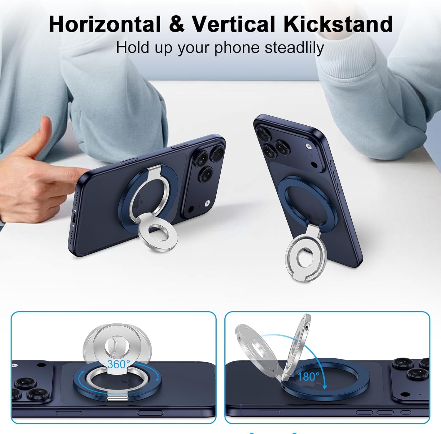 【Compatibility with All Cell Phone】Simply attach this magnetic phone ring stand directly to your iPhone 17 Pro Max/16 Pro Max/16 Pro/16 Plus/16e/16/15/14/13/12 series or any iPhone or Android phone like Samsung Galaxy S25 Edge/S24/S23/S22/S21/S20/S10 series, or Google Pixel 10/9a/8a/7a/6a/9/8/7 Pro with a Magnetic phone case. For other android phones or iPhones below iPhone 12, without a magnetic phone case, please install the metal ring (included in the package) onto your phone before use.