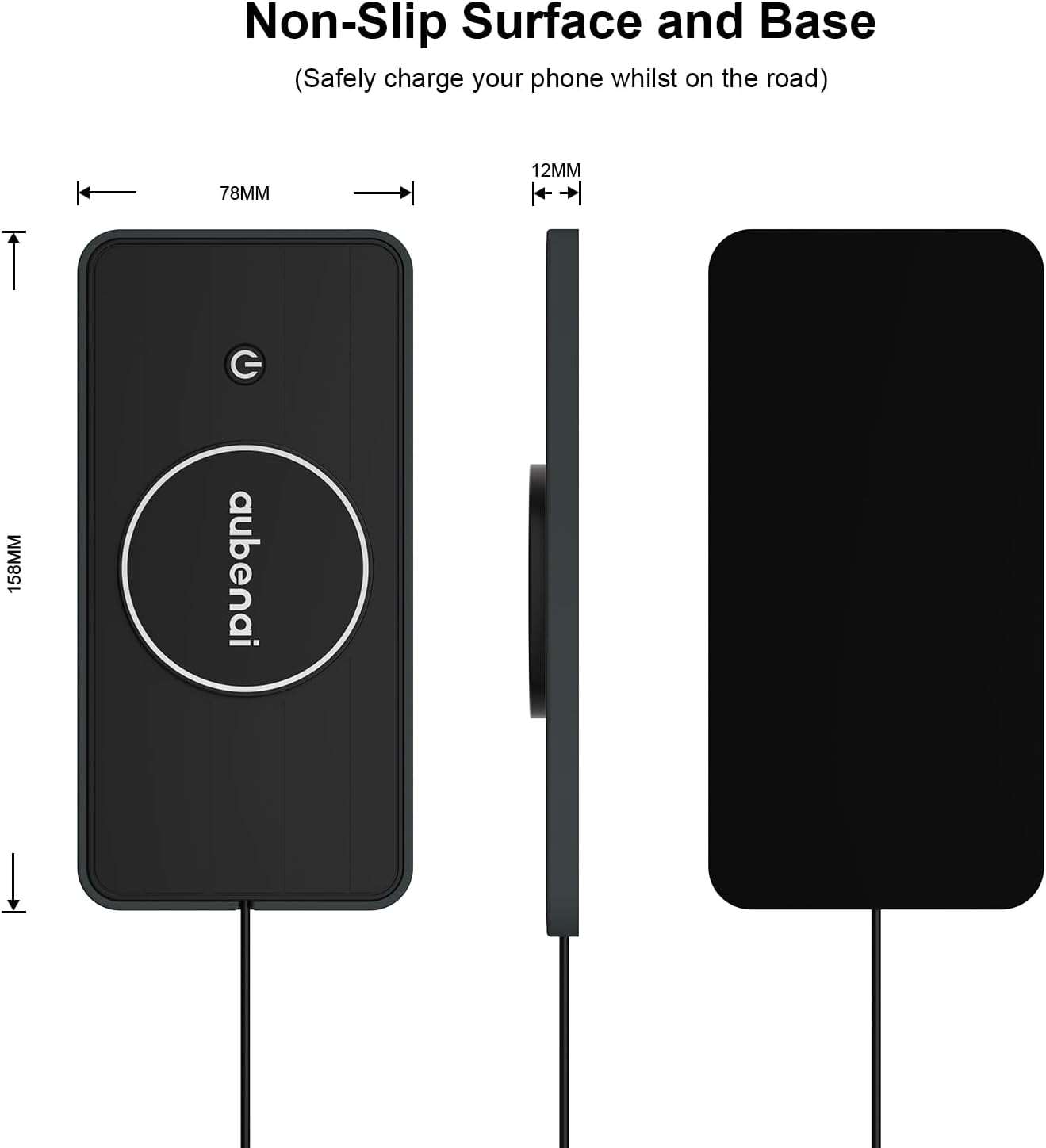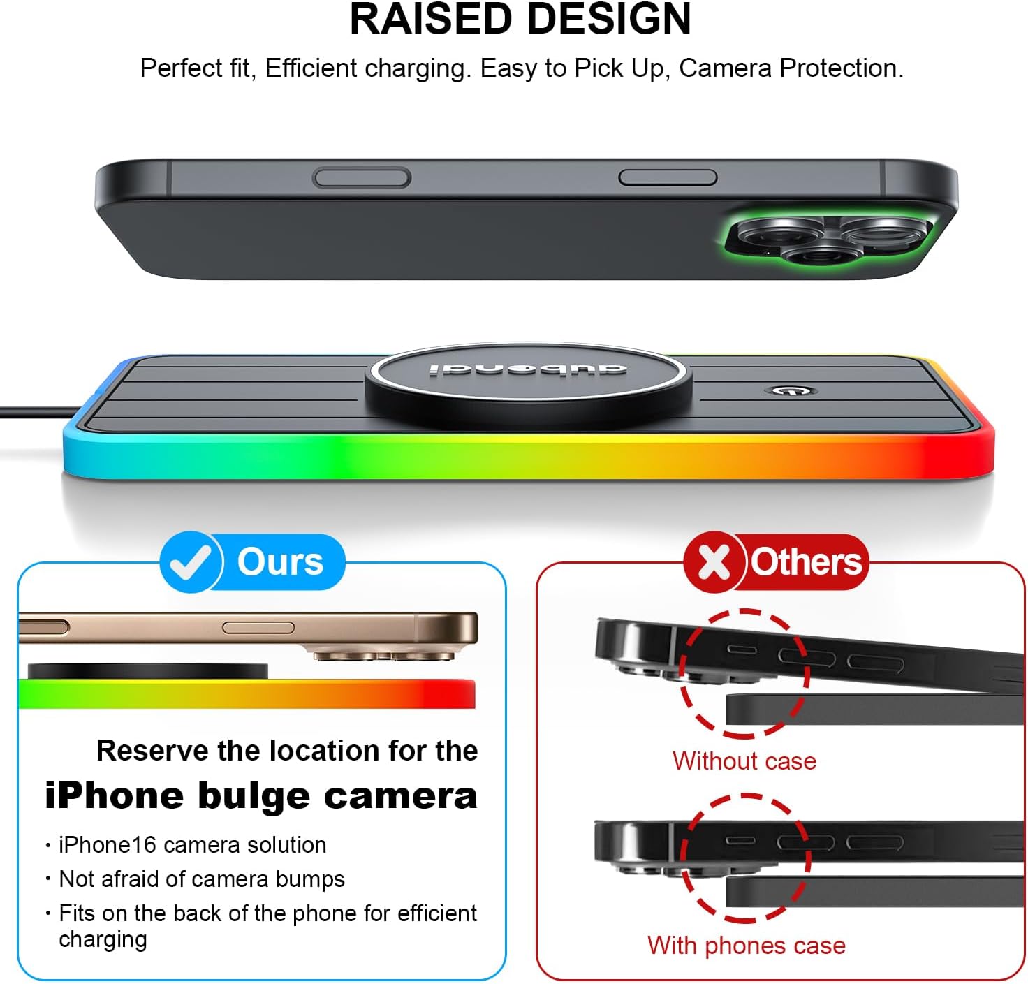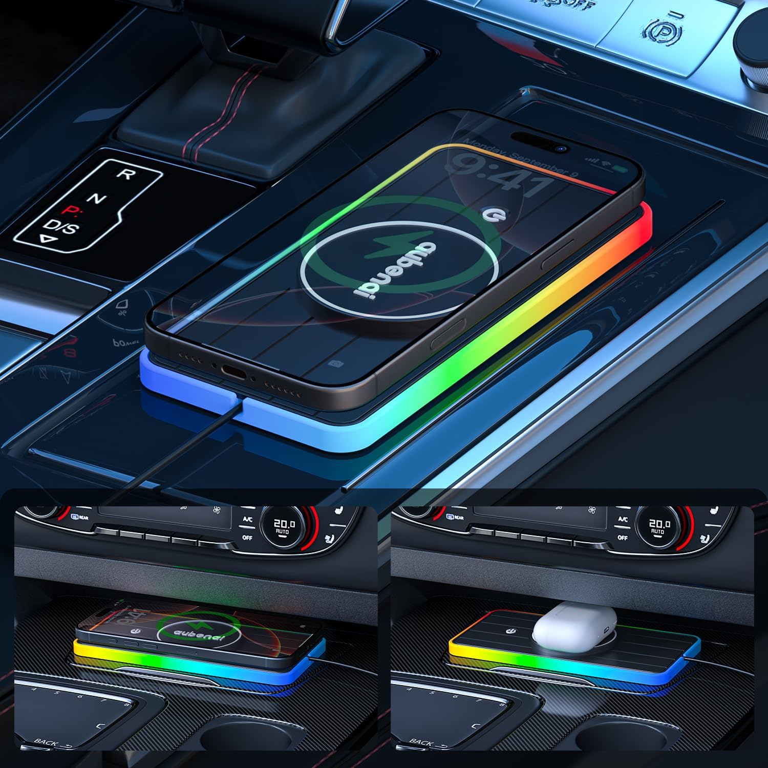 Upgraded RGB Lighting & Space-Saving Design: This wireless charging pad features a 360° RGB LED light ring with 26 vibrant LEDs, offering dynamic multicolor auto-cycling or customizable single-color modes (red, green, blue, purple). Perfect for enhancing your car’s ambiance and making it easy to locate your phone at night. A dedicated button lets you quickly switch between lighting modes or turn the lights off—so you can personalize your drive. Compact & Car-Friendly: With a sleek 6.2 x 3.1-inch (158mm x 80mm) design, this charger fits snugly in tight spaces while delivering fast, reliable wireless charging. No bulk, just seamless power on the go