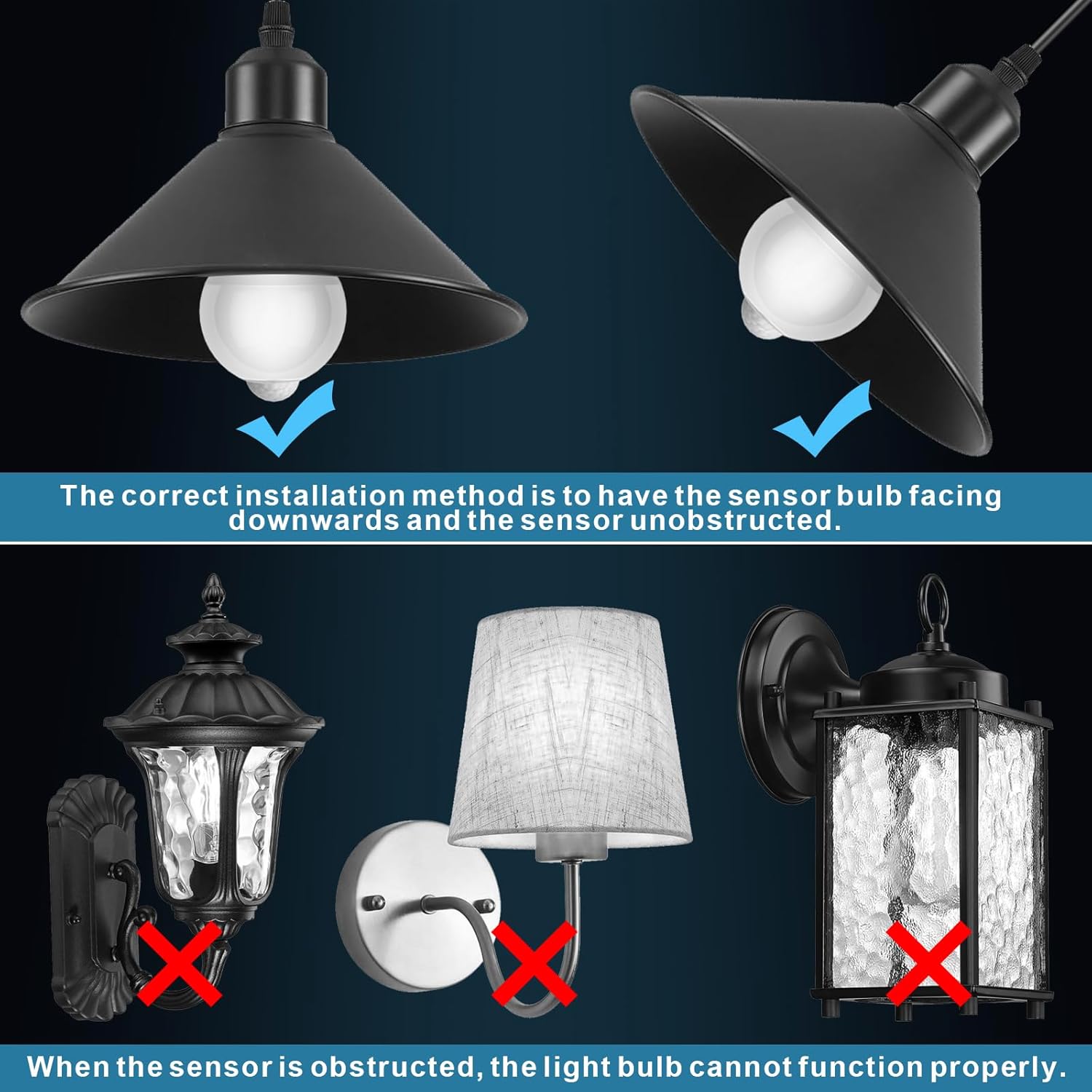 3. The bulb of this PIR motion sensor cannot pass through glass or any lampshade, and must be installed facing downwards.
