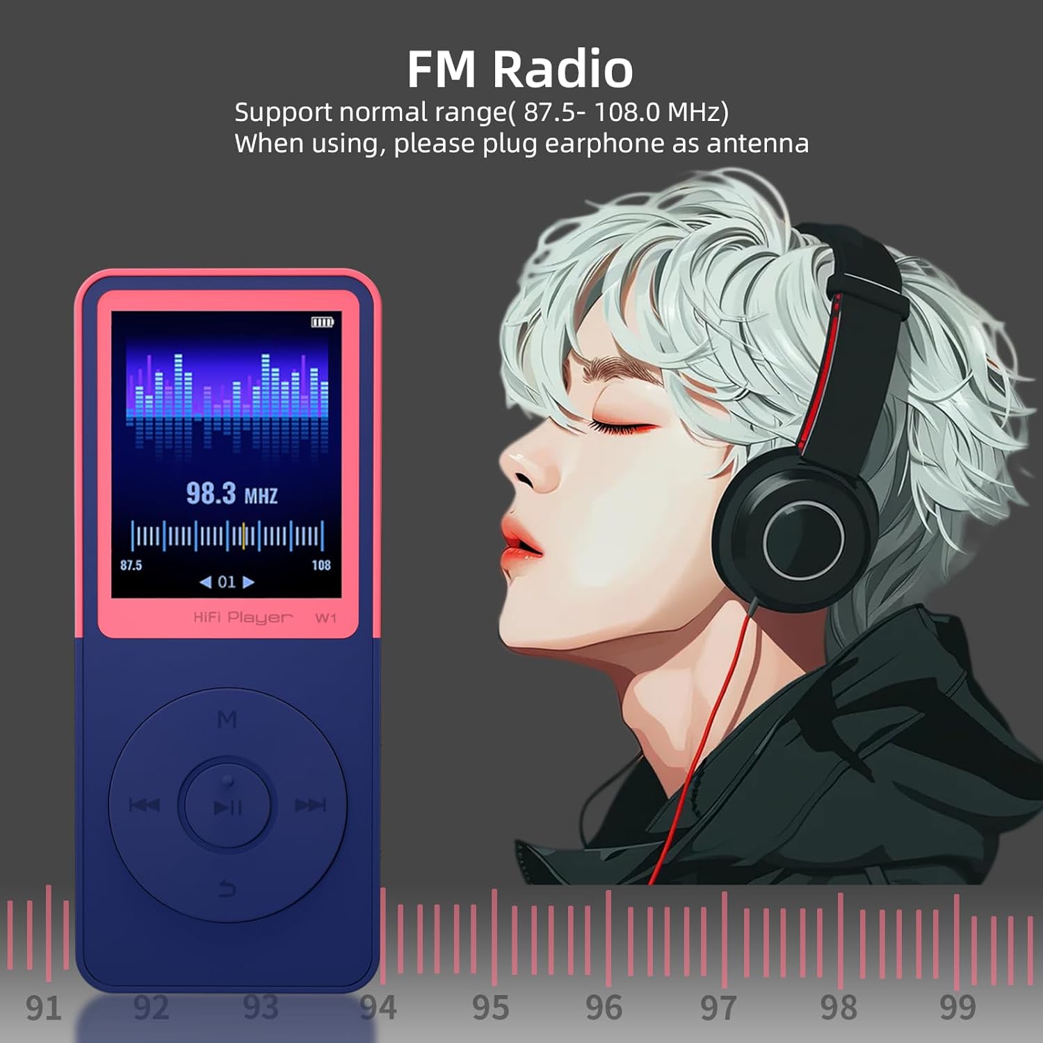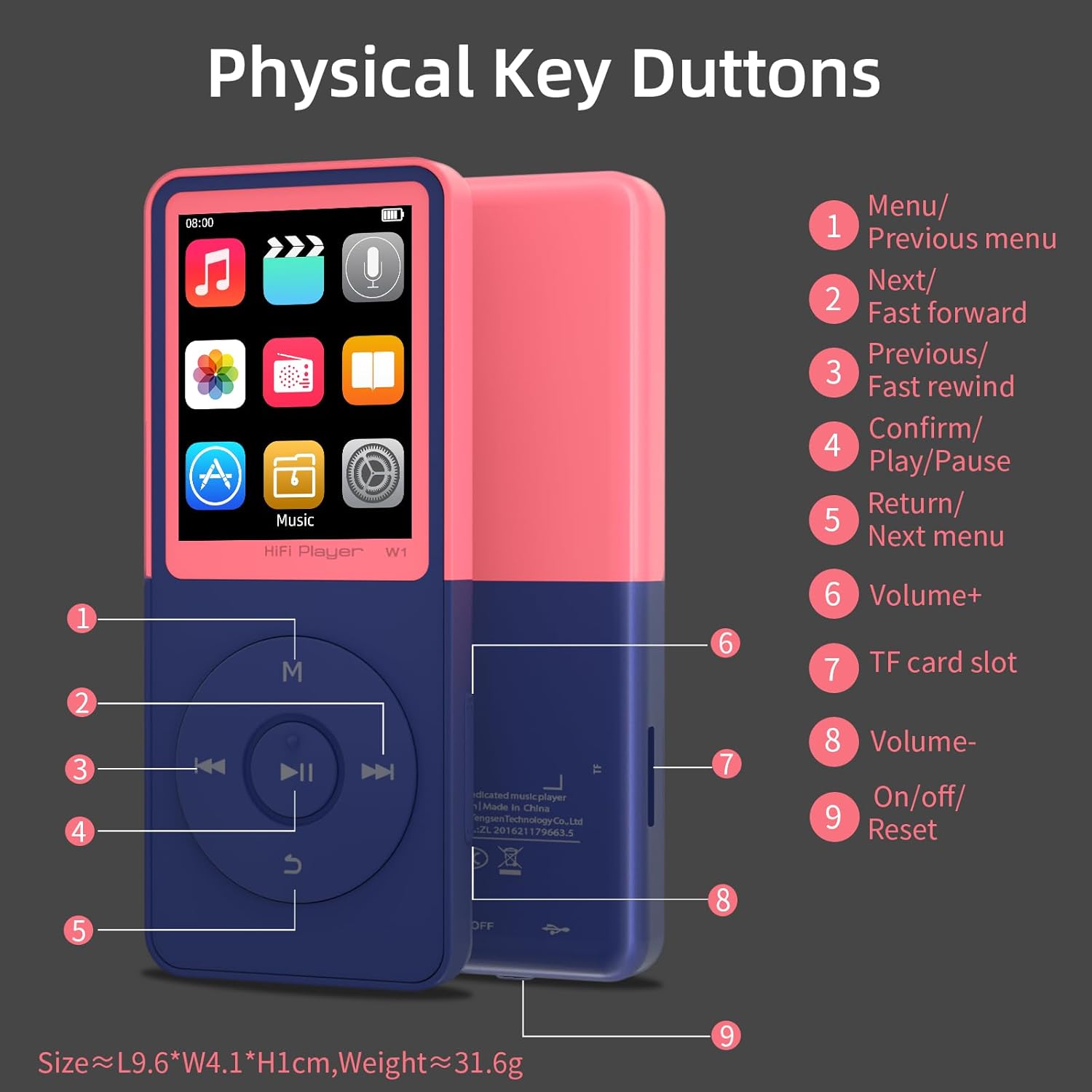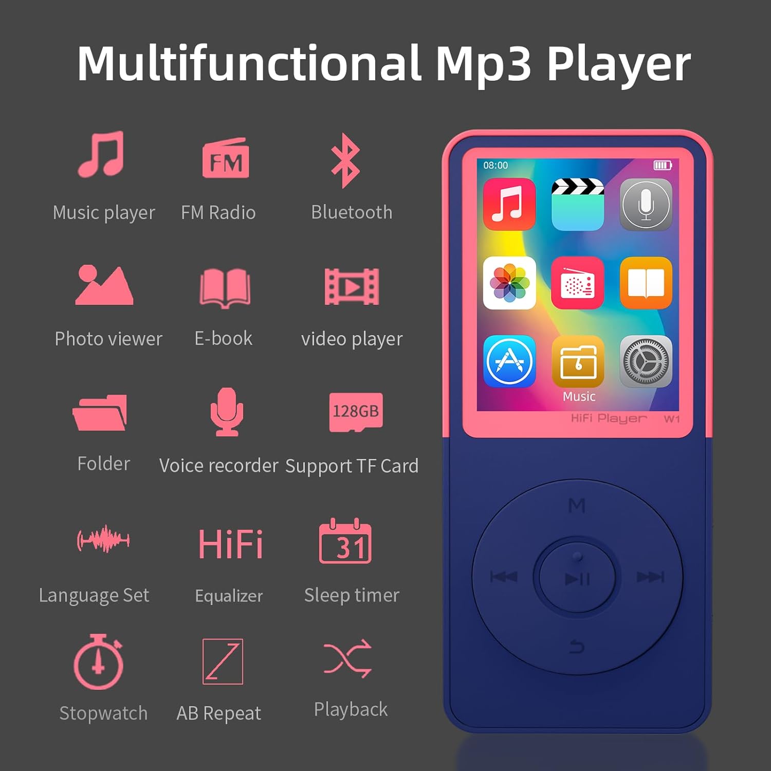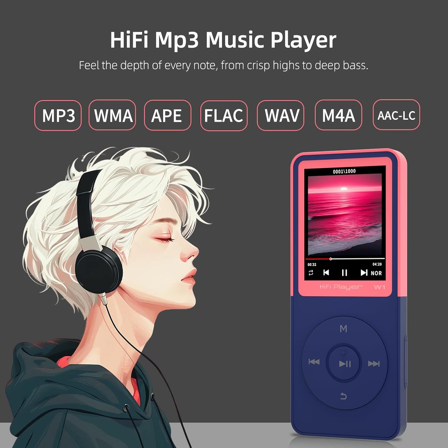 【Mp3 Player,Hifi sound】Portable music player expandable up to 128GB via micro SD card (not included). Store thousands of songs and enjoy high-fidelity HiFi sound thanks to a high-performance music decoding-chip, delivering clear vocal playback.Mp3 music player supports a wide range of music formats including MP3、WMA、APE、FLAC、WAV、AAC-LC (APE/FLAC requirements: 8kHz-48kHz, <900kbps). Additionally, this mp3 player supports video formats like AVI (conversion tool required).