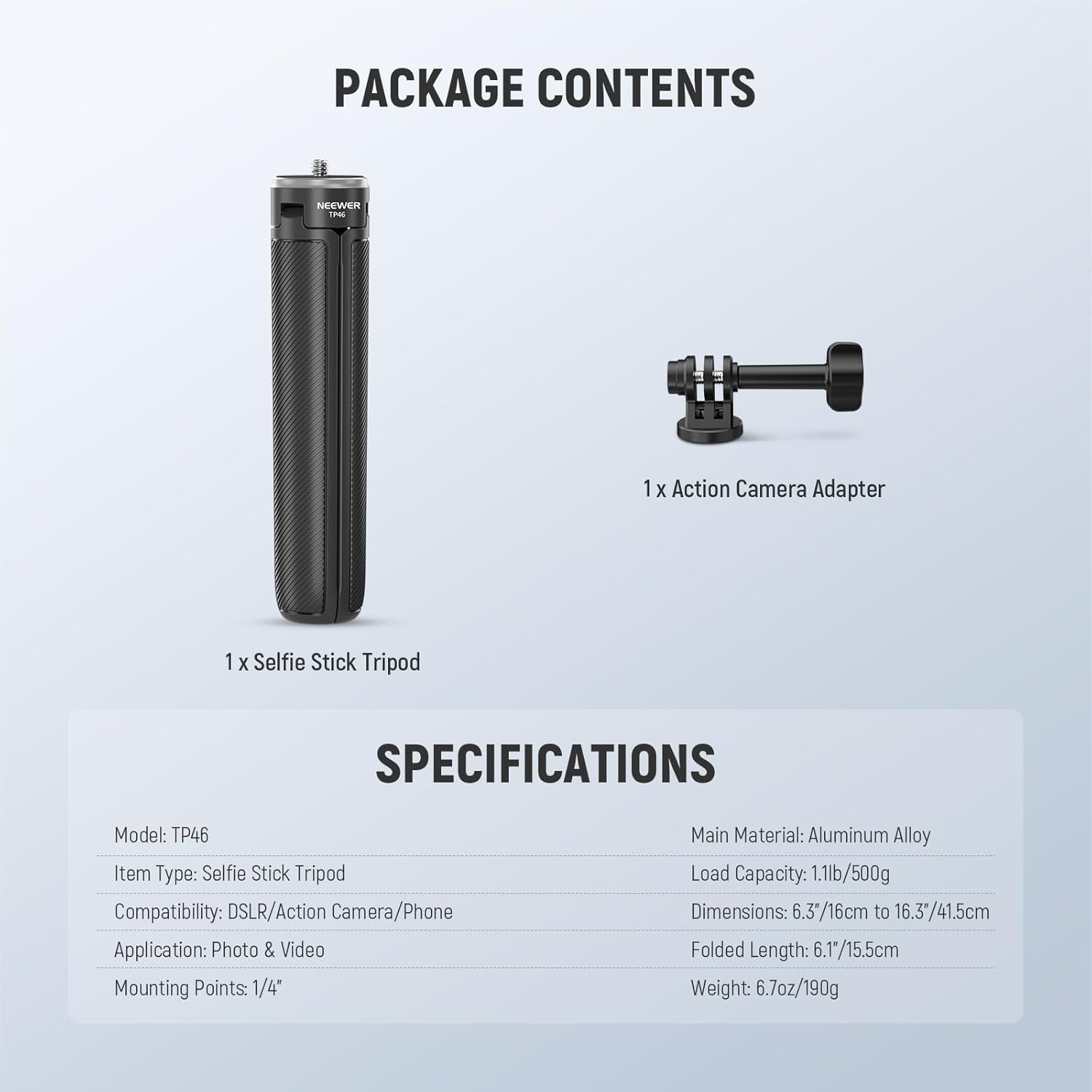 NEEWER Basic Selfie Stick Tripod for DSLR Action Camera Webcam, Mini Vlogging Video Desk Stand Accessories Compatible with GoPro Hero 13 12 Insta360 DJI Osmo Action 5 Pro AKASO EK7000 Brave 4 7, TP46