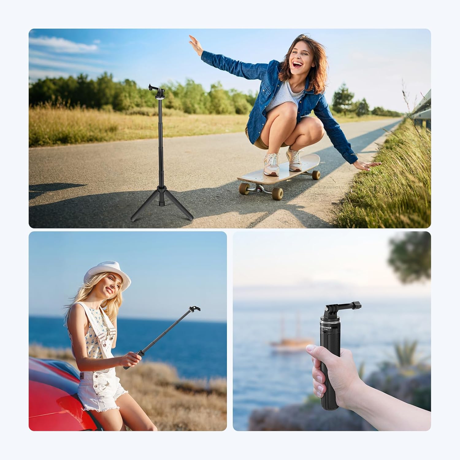 【Tripod Stand for Action Camera】 Mount the action camera adapter via the top 1/4″ screw, compatible with GoPro Hero 13 Go Pro 12 11 10 9 Black compatible with DJI OSMO Action 5 Pro 4 3 compatible with Insta360 X4 X3 GO3 Insta 360 Ace Pro action cams compatible with DJI Osmo Pocket 3 handle, etc. You can also attach a phone holder or other photography and videography accessories, gears, or equipment like a monitor, fill light, or microphone (all not included) for versatile use