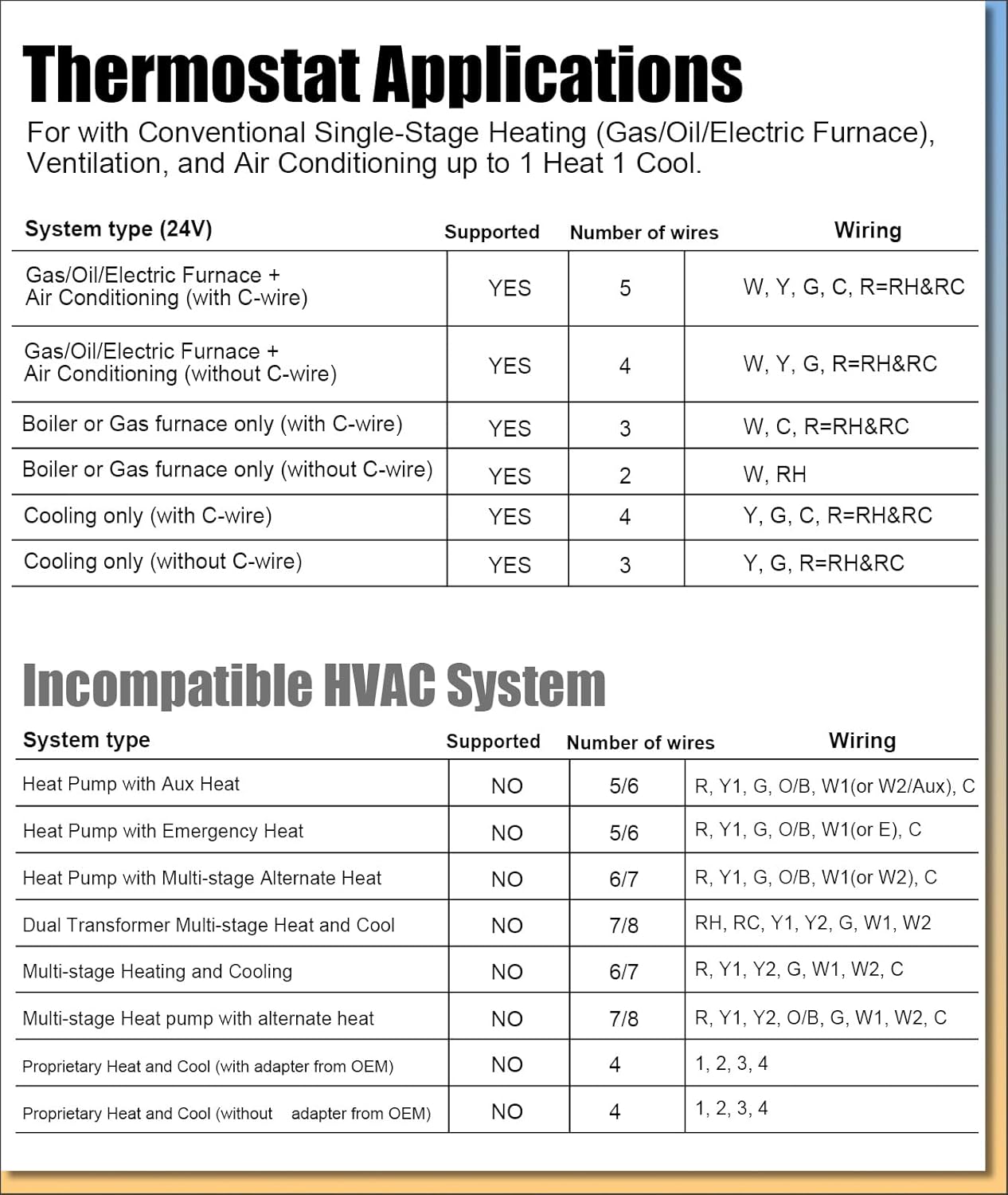 COMPATIBILITY: Works with conventional single-stage systems up to 1 Heat/1 Cool, including gas/oil/electric furnace, air conditioning, and Only 1H/1C heat pump (without aux) systems.