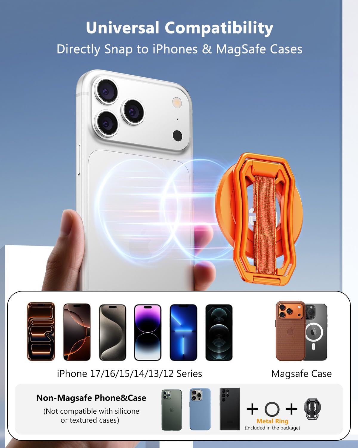 【Powerful N52 Magnet, Worry-Free Stability】Equipped with N52 NdFeB magnets, this MagSafe phone grip stand delivers strong magnetic attraction, supporting over 3.97 lbs (1.8 KG). It fits MagSafe devices securely, preventing slippage during one-handed use, movement or exercise. Compatible with iPhone 17/16/15/14/13/12 series; non-MagSafe devices can use the included metal ring for boosted magnetic strength.