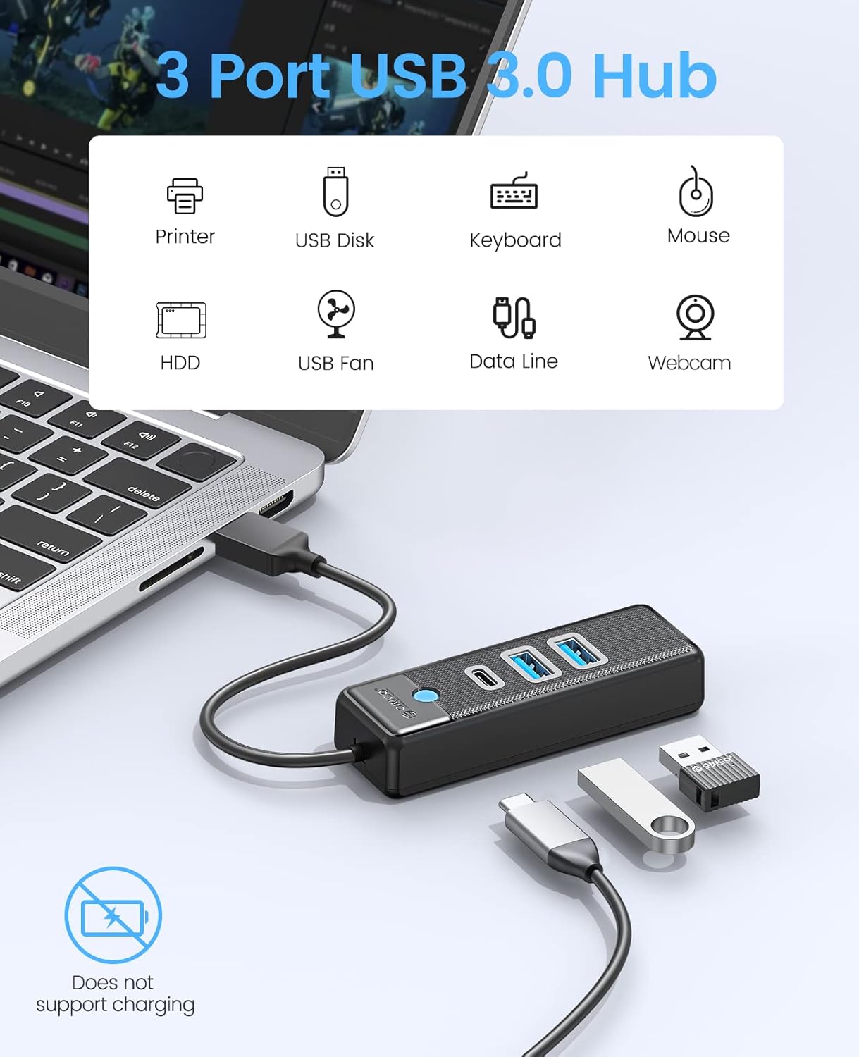 【Great Compatibility】 ORICO 3-port USB hub applies to various devices: laptop, pc tower, XBOX, PS4, flash drive, keyboard, mouse, card reader, HDD, cellphone OTG adapter, printer, camera, USB fan and USB cables.
