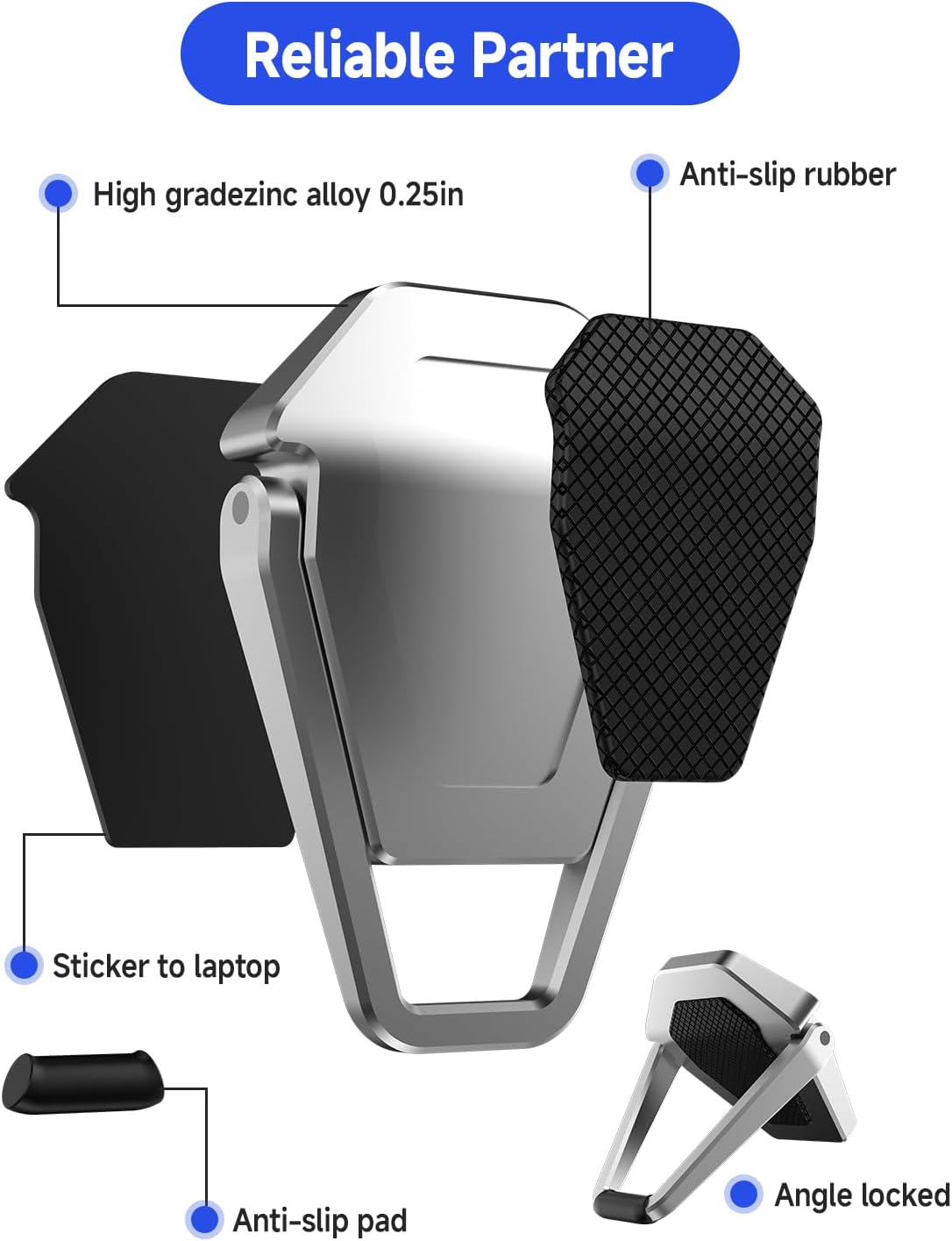 Sturdy Secure Stand: The laptop stand is made of aluminum alloy, with a triangular design to secure your laptop and keyboard, and a silicone ring at the bottom of the stand to increase friction with the desktop to prevent the device from sliding and scratching