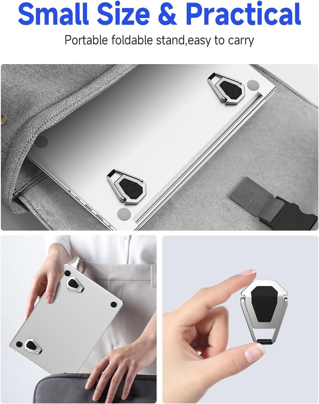 Lightweight & portable design: This foldable laptop stand weighs only 46 grams. The size is only 1.73 inches x 1.38 inches (about 4.8 cm x 3.5 cm) when folded. It can be put into a backpack and carried around. Whether it is going to school, office or business travel, it can provide you with convenience.