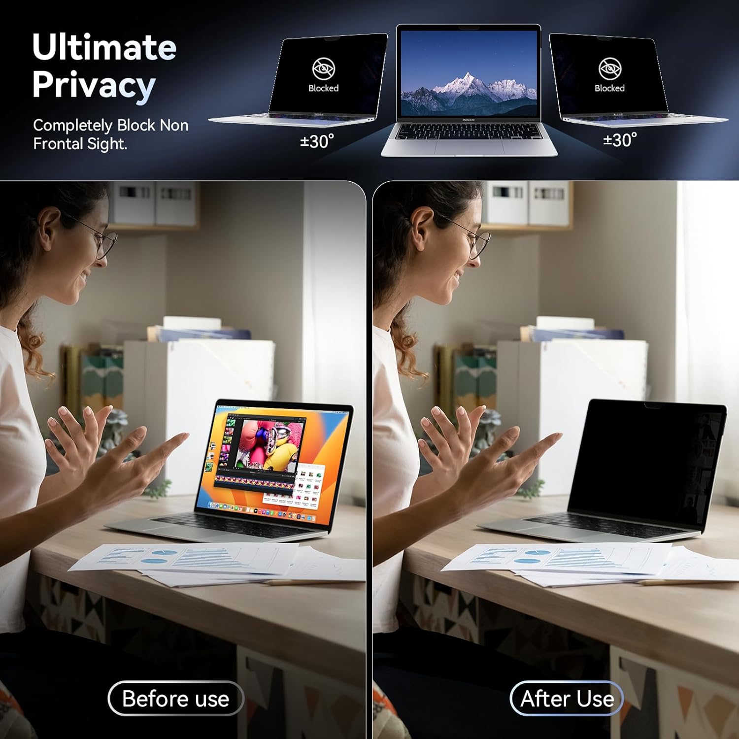 【Ultimate Privacy Protection】MacBook Air 13 inch privacy filter with unique ultra-thin micro-louver technology, our computer privacy screens limit the viewing angle to approximately 30 degrees on each side. Thus protecting your laptop screen data. (Note: this does not block the view behind you). Additionally, our complimentary sliding camera cover further protects your privacy.