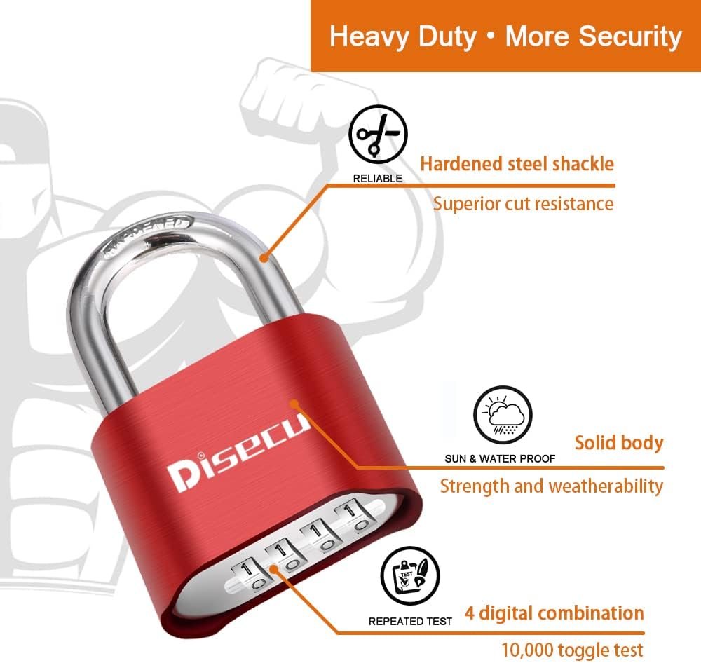 1 Pack disecu 4-Digit Heavy Duty Combination Lock, Outdoor Waterproof Combo Padlock for School Gym Locker, Storage Unit, Shed, Fence, Gate, Garage (Red)