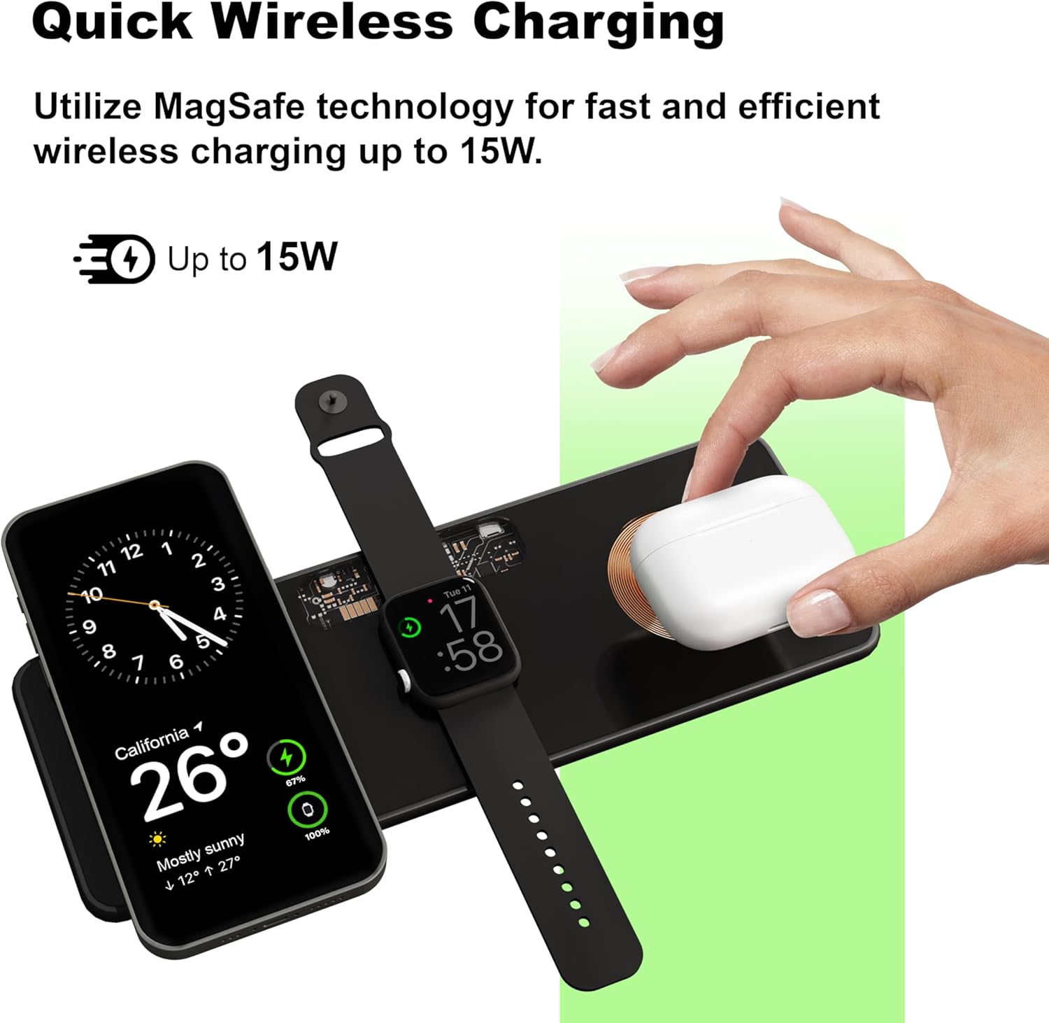 3-IN-1 WIRELESS CHARGER: Charge your phone, Apple Watch, and another phone or device at the same time