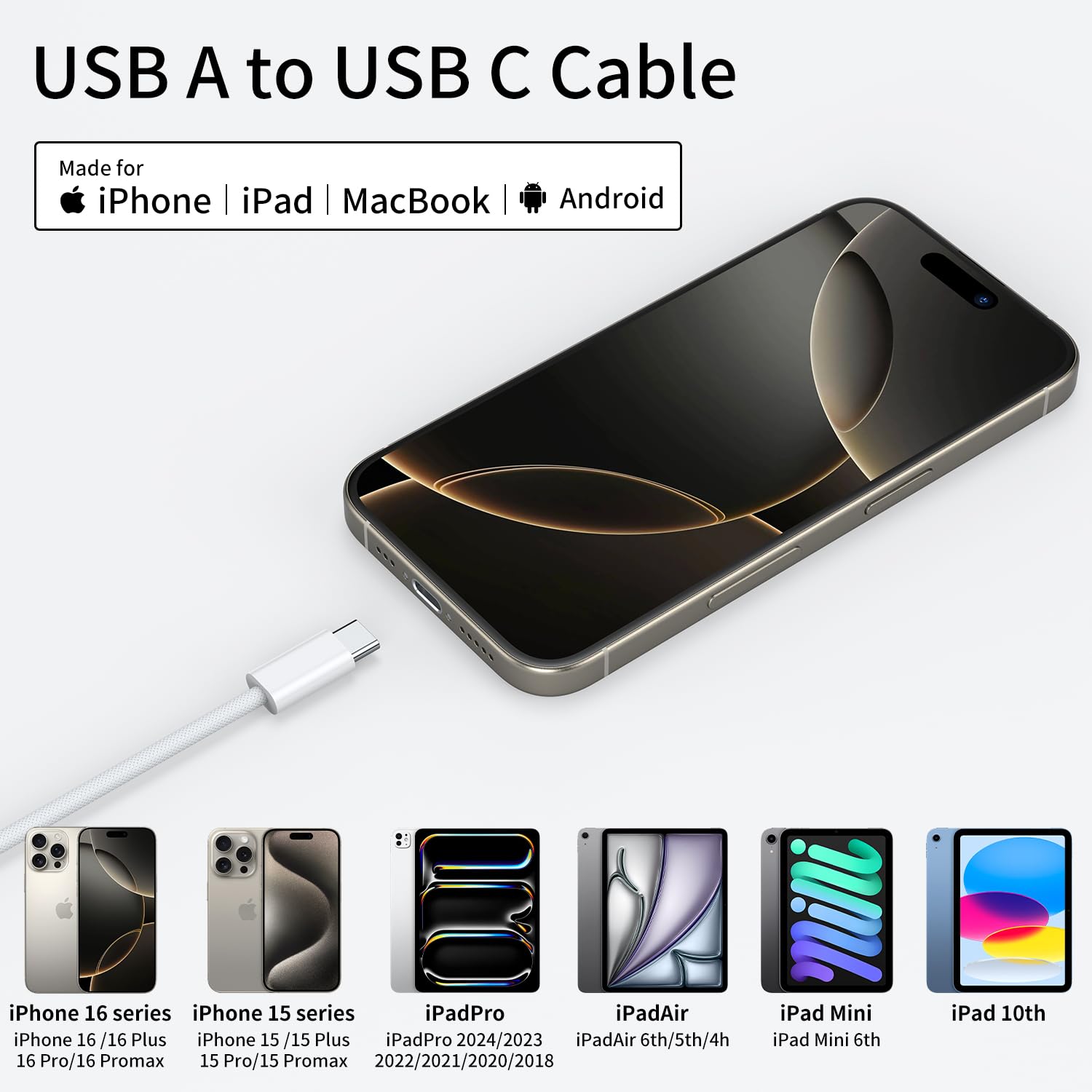 Car Carplay Cable for iPhone 15/16 Pro Max/Plus, 3.3FT 2Pack USB A to USB C Charging Cord Compatible Apple iPhone, iPad Pro 13/12.9/11 inch, iPad Air 5/4th Mini 6th Gen Charger