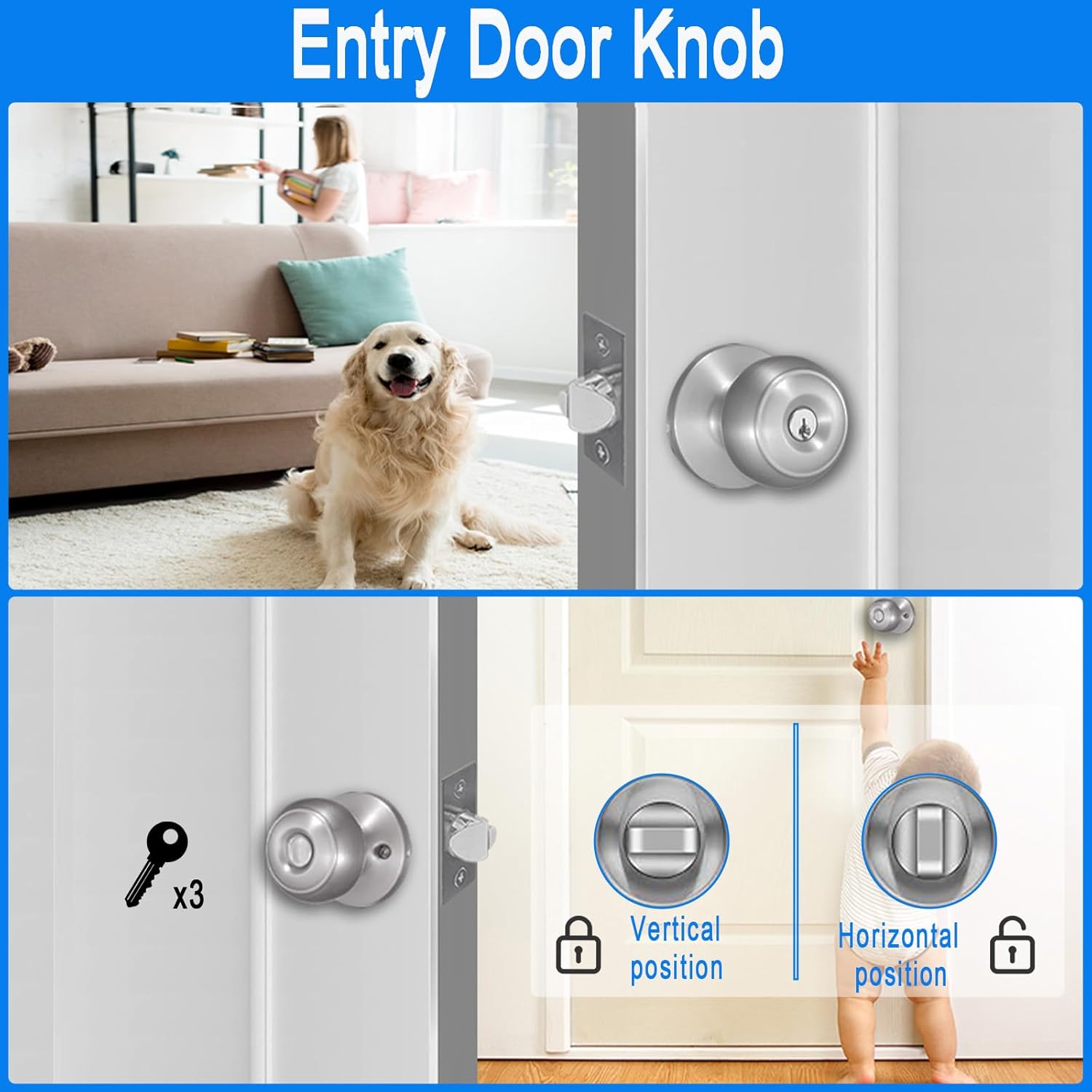 Door Knob with Keyed Lock Easy Install Brass Door Knobs Interior Exterior Safe Secure Entry Satin Brass Universal Fit Brushed Door Knob Closet Bedroom Bathroom Polished Elegant Design (Silver, 3 pack)