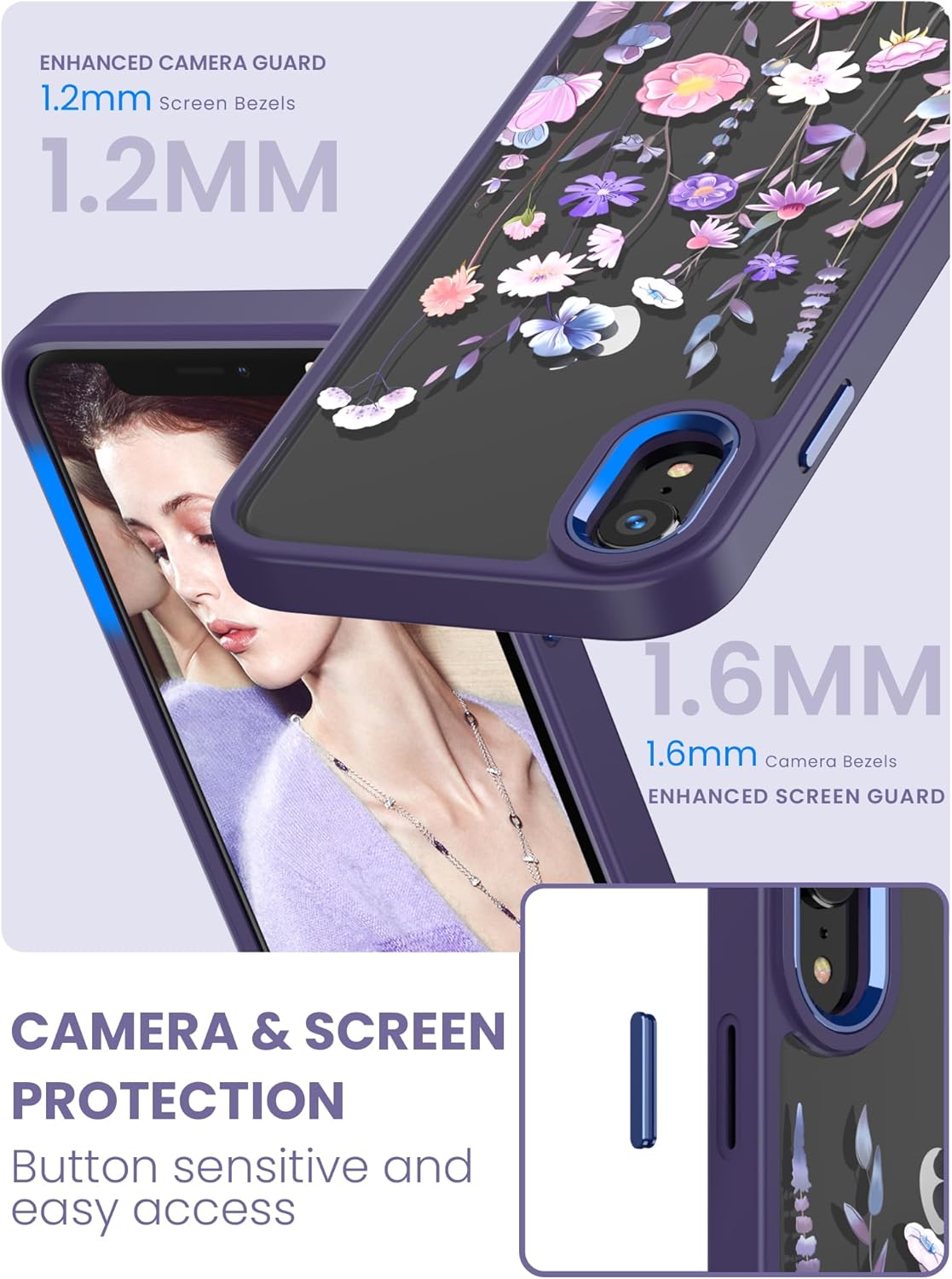 Dretal for iPhone XR Case Flower, Military Grade Drop Tested Hard Back & Soft Edge Slim Flower Women Girls Phone Protective Cover with Tempered Glass Screen Protector for iPhone XR (Deep Purple)