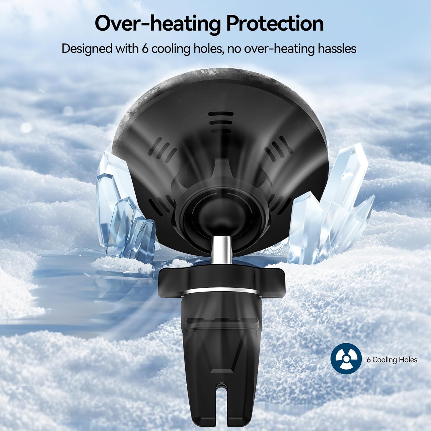 Advanced Overheating Protection: Designed with 6 air vents, this MagSafe car charger effectively dissipates heat, keeping both your phone and the charger cool even during extended use. The tempered glass surface further enhances heat dissipation and charging efficiency, ensuring safe and stable performance.