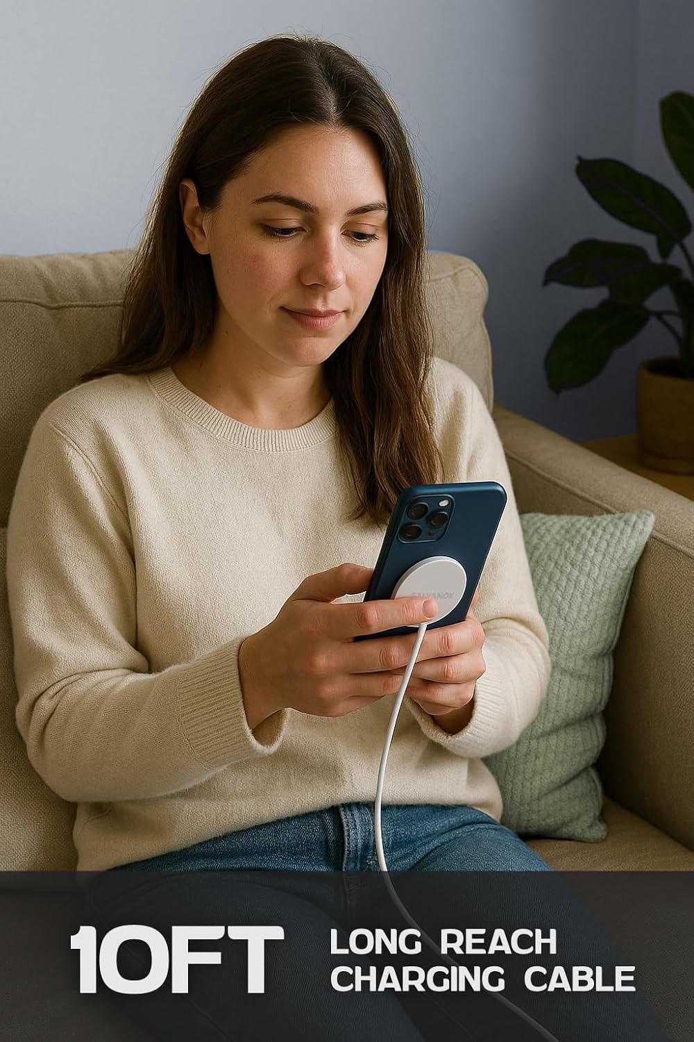 Extended Reach: Extra-long charger snaps magnetically to your iPhone for a secure and easy wireless charging experience. (Compatible with MagSafe)