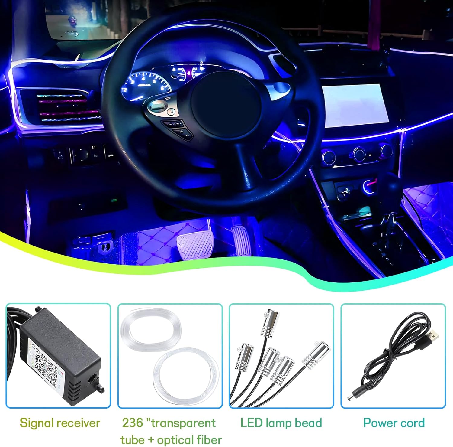 Interior Car LED Strip Lights with Wireless APP Control, 5 in 1 Car Ambient Lighting Kit with 236 Inch Fiber Optic, Sync to Music Interior Car Lighting Accessories