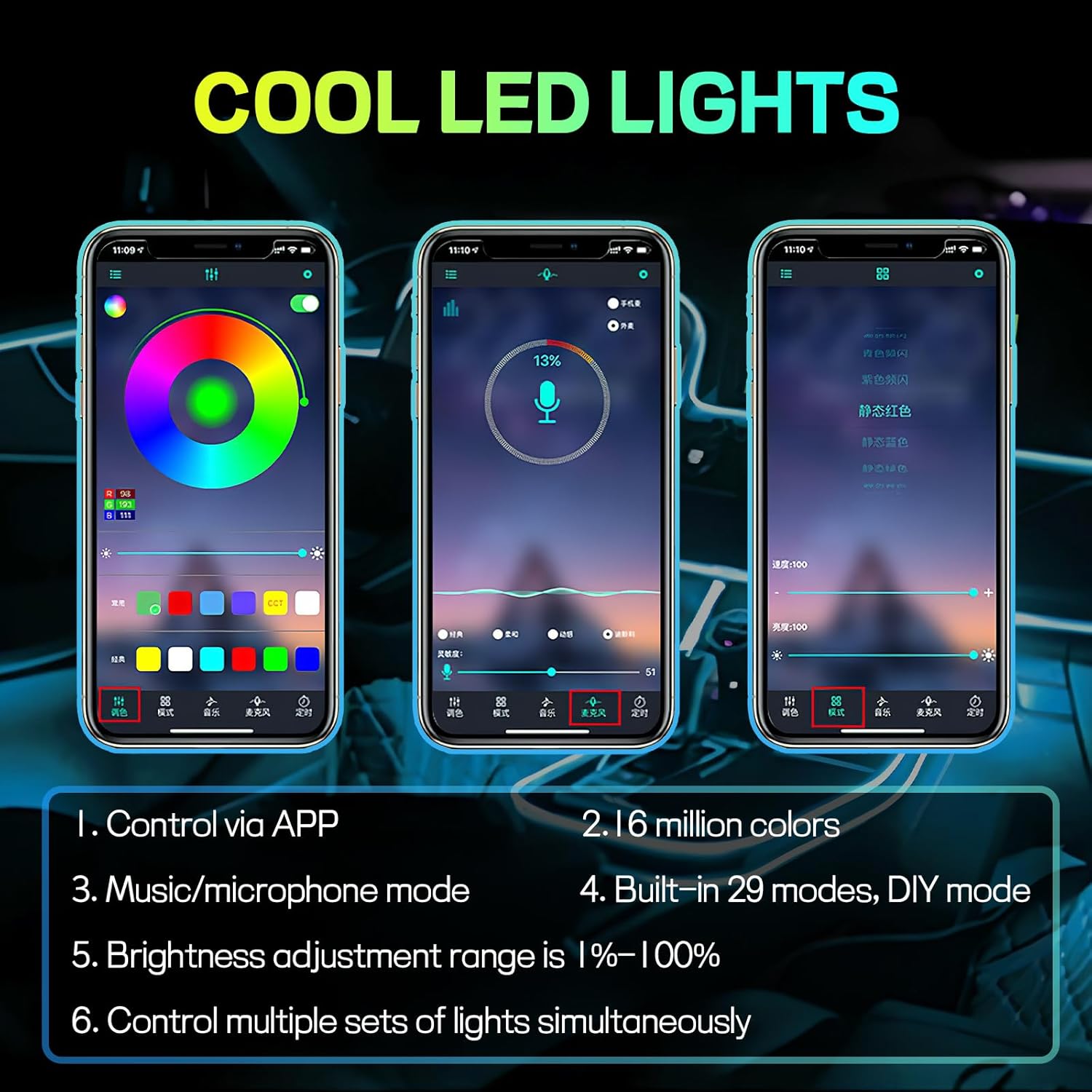 【Wireless APP Control】: This interior light kit supports cell phone APP control. Therefore, you can easily manage the color and brightness of the lights, change the mode, set the timer, and turn the lights on/off. You will enjoy a comfortable and energetic driving experience through convenient control.