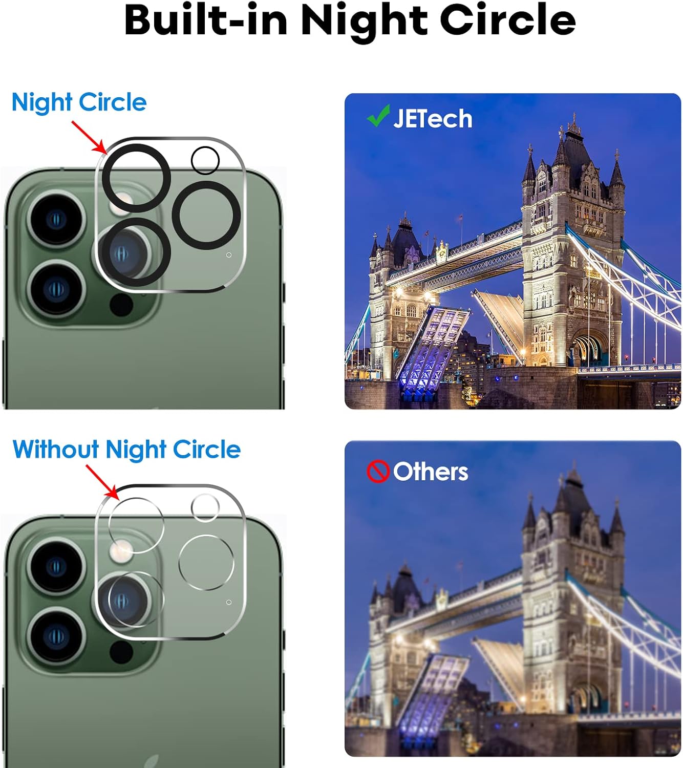[Night Shooting Mode] The camera lens protector with upgraded built-in night circle allows you to use the flash function normally at night. High light transmittance ensures the original quality of pictures and videos