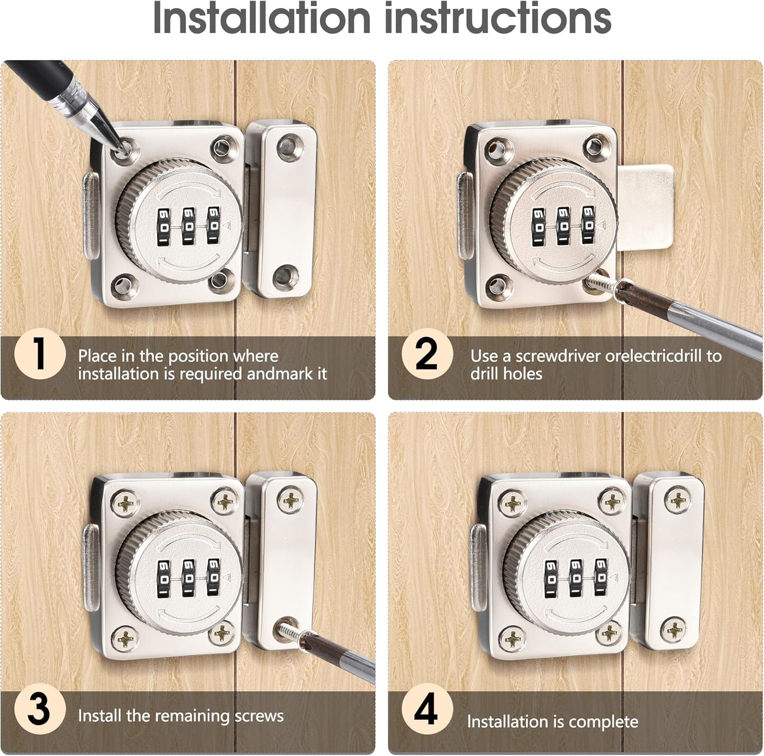 Easy to Install: After selecting the installation position and marking it, fix it with screws. After turning the lock head and setting the password, the installation is complete. The package includes 1 x Cabinet Password Latch, 1 x Screwdriver, and 6 x Screws.