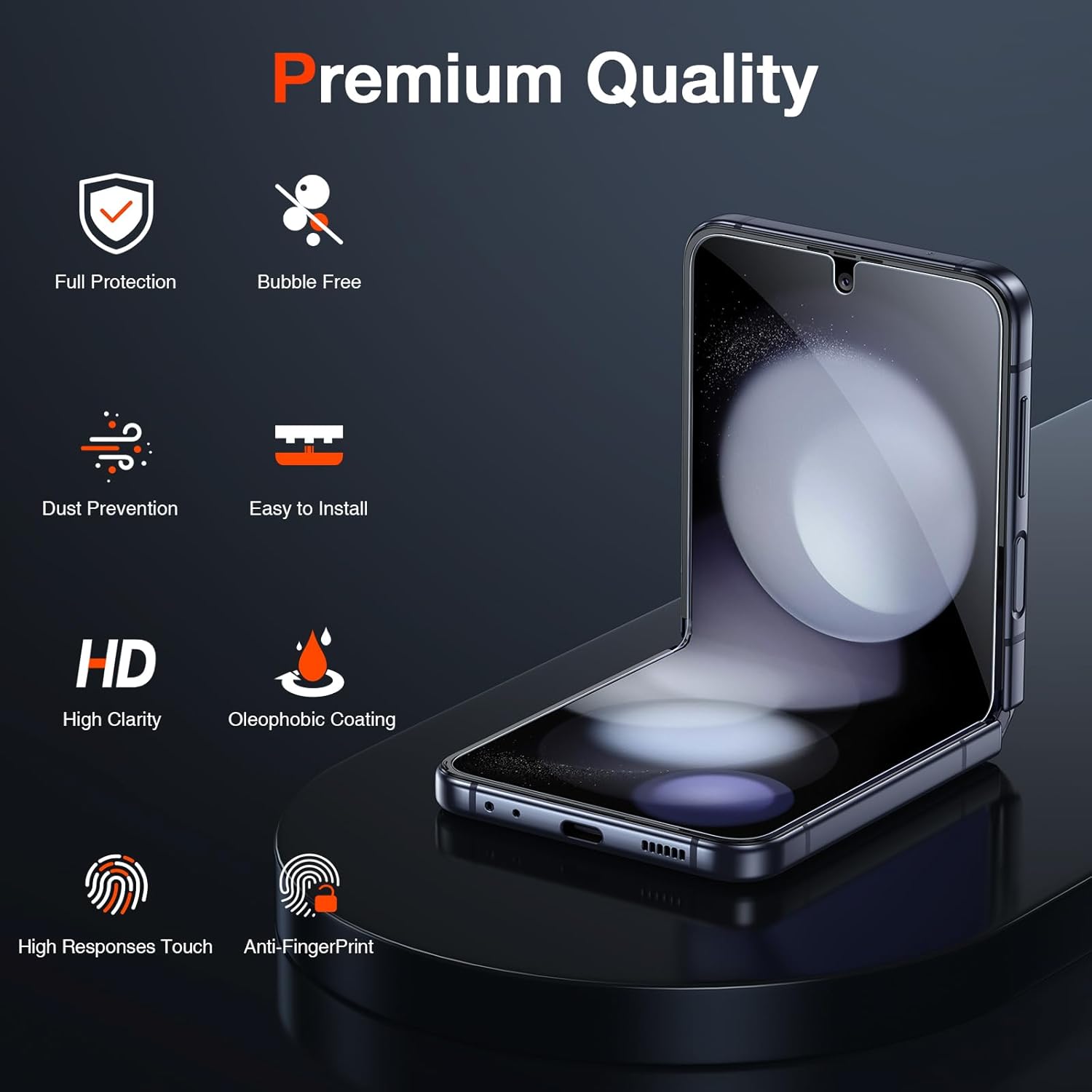 【High Definition & Smooth Touch】With 99% High Transparency and Ultra-thin Design, Samsung Galaxy Z Flip 5 Screen protector brings bright and colorful image quality, keeping an original visual experience for you. High-response Haptic Touch Technology supports Fingerprint Unlock, ensuring quick app launching. You can enjoy the original touch of the Samsung Galaxy Z Flip 5 Screen protector.