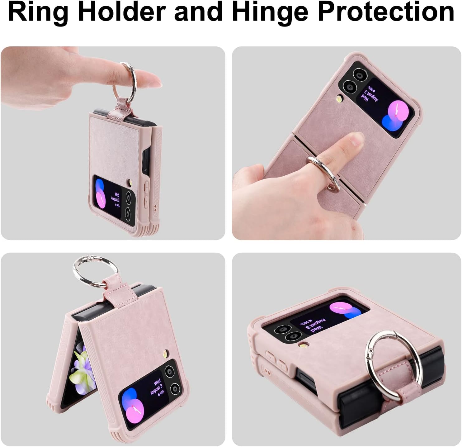 MONASAY Phone Case Compatible for Galaxy Z Flip 4,[Screen Protector Included] Leather Cell Phone Cover with Ring Fit for Samsung Galaxy Z Flip 4 5G Pinksand