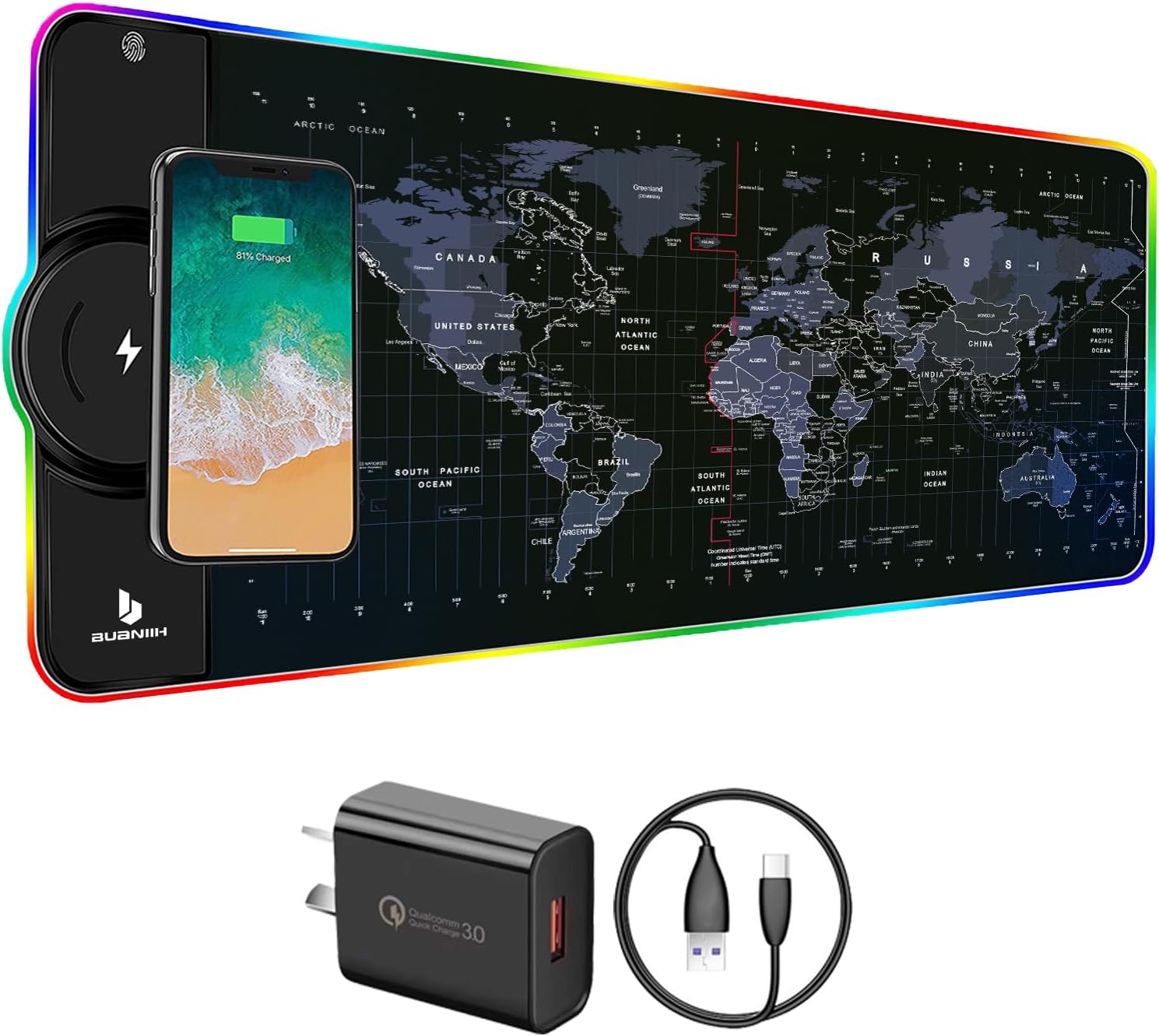Mouse Pad,Wireless Mouse Pad Charging,15W Fast Charging,Extened Large Size,10 Lighting Modes for Office,Mobile Phone Devices,31.5″X11.8″World Map