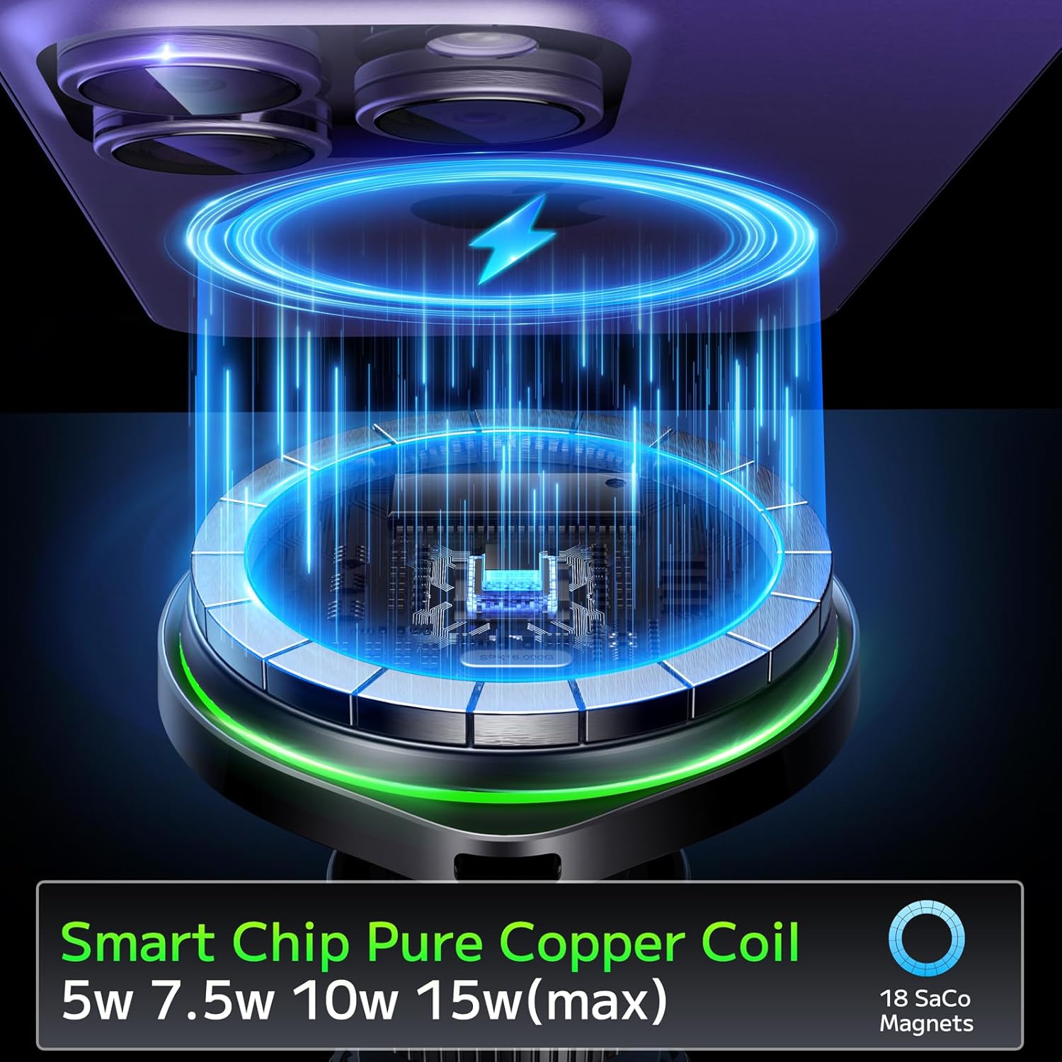 [Upgraded Intelligent Charging Core] For Magsafe car mount has upgraded long life core from over-temperature protection, over-voltage protection. The chip of phone car mount is made of high-quality pure copper coils, which can be compatible with super fast charging of 5w 10w and up to 15w. In addition, car phone holder charger can intelligently adjust the charging power according to the charging process of the cell phone in order to increase the life of smartphone battery.
