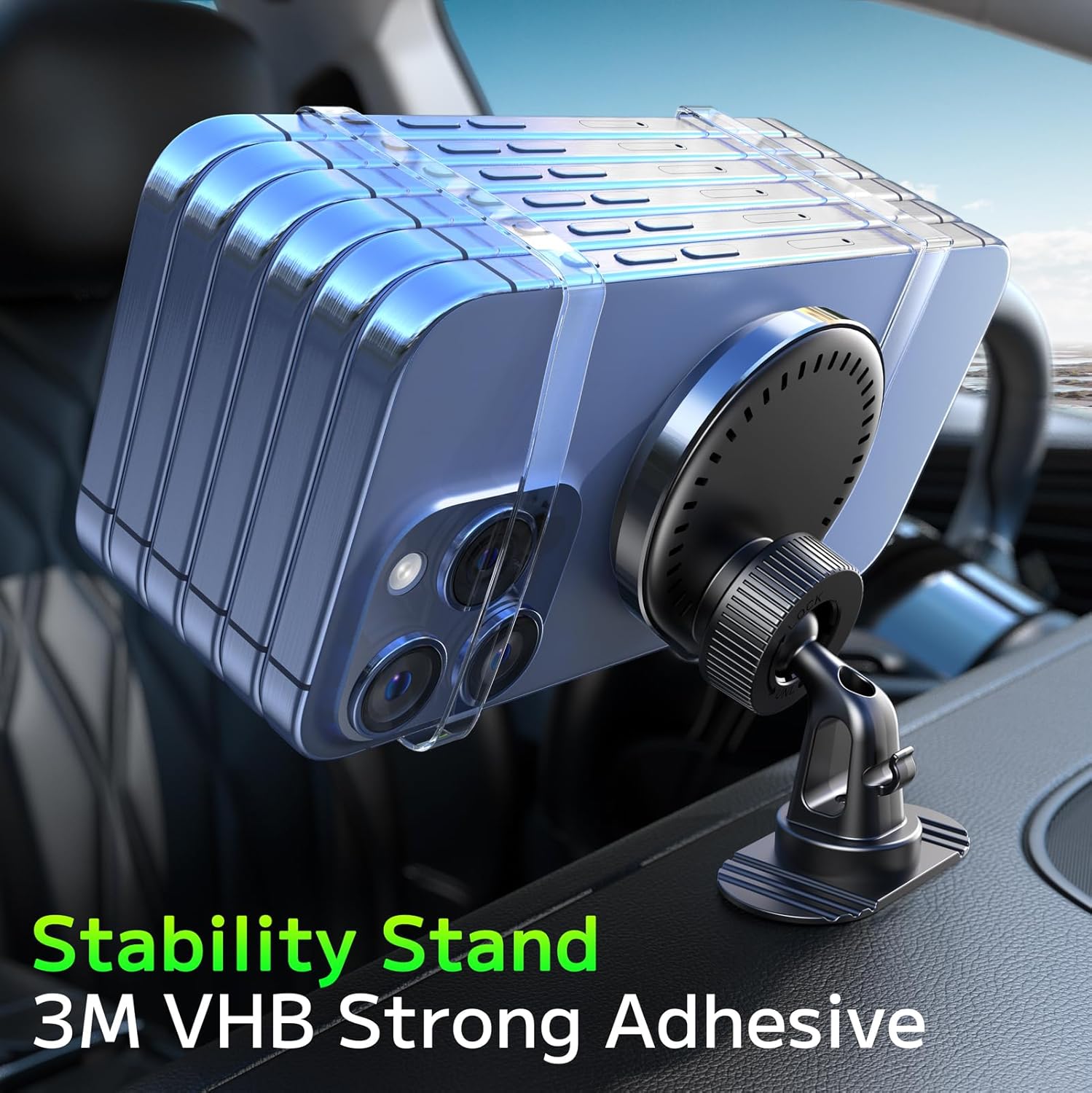 [2-in-1 Dashboard and Vent Mount] For Magsafe Car Mount Charger has a 3m adhesive base bracket that mounts securely to the dashboard and comes with an upgraded silicone base vent hook clip that protects both the phone and the vent blade. You are free to choose the installation method of Magnetic phone holder for car and can satisfy the needs of multiple usage scenarios.