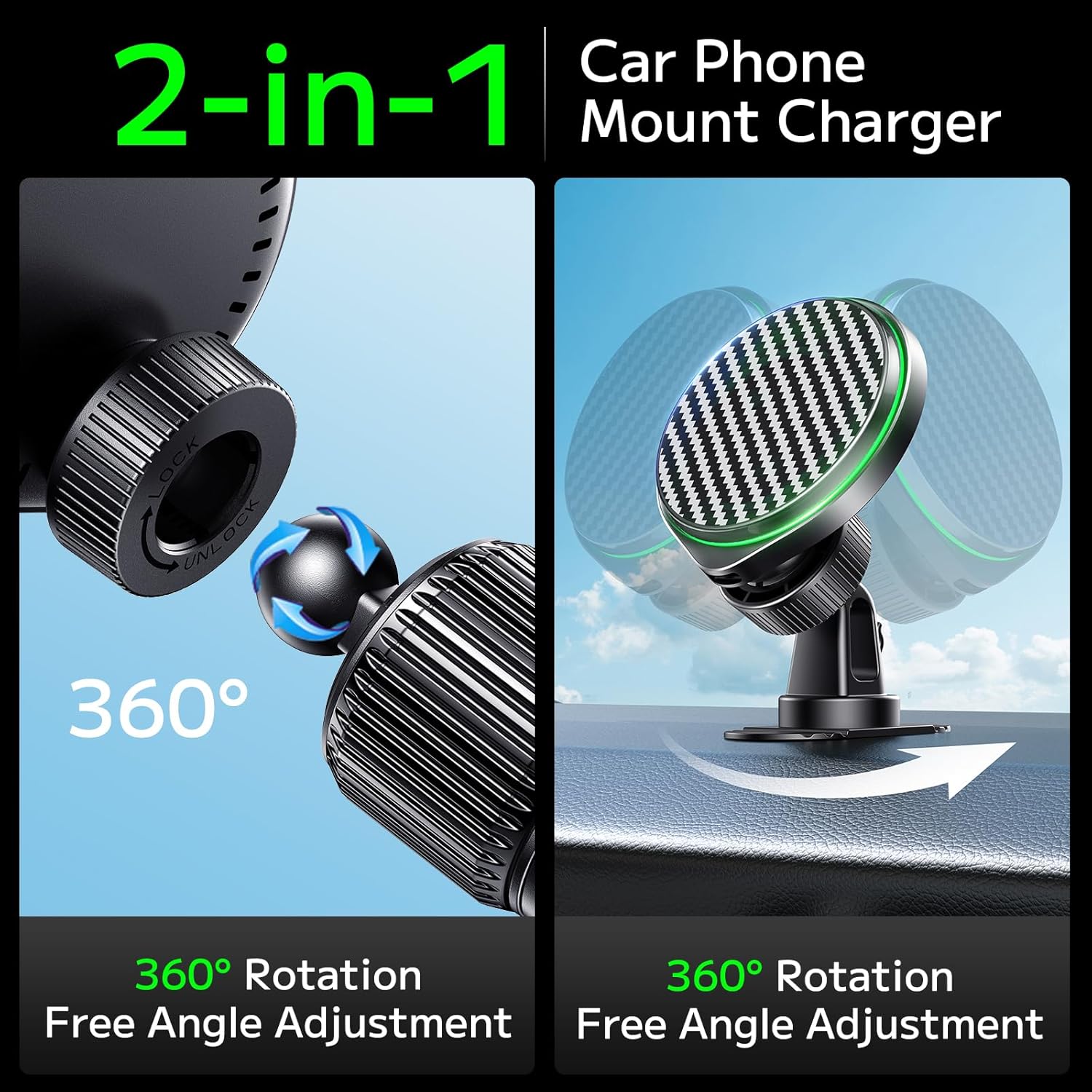 [360°Free Adjustment] Car magnet phone mount has a ball head that can be freely adjusted in angle. When you mount for magsafe charger car on the air vents, you can rotate the phone freely into vertical and horizontal orientation, and when you mount on the dashboard, you can still have 120° of wide-angle adjustment when it’s in place.