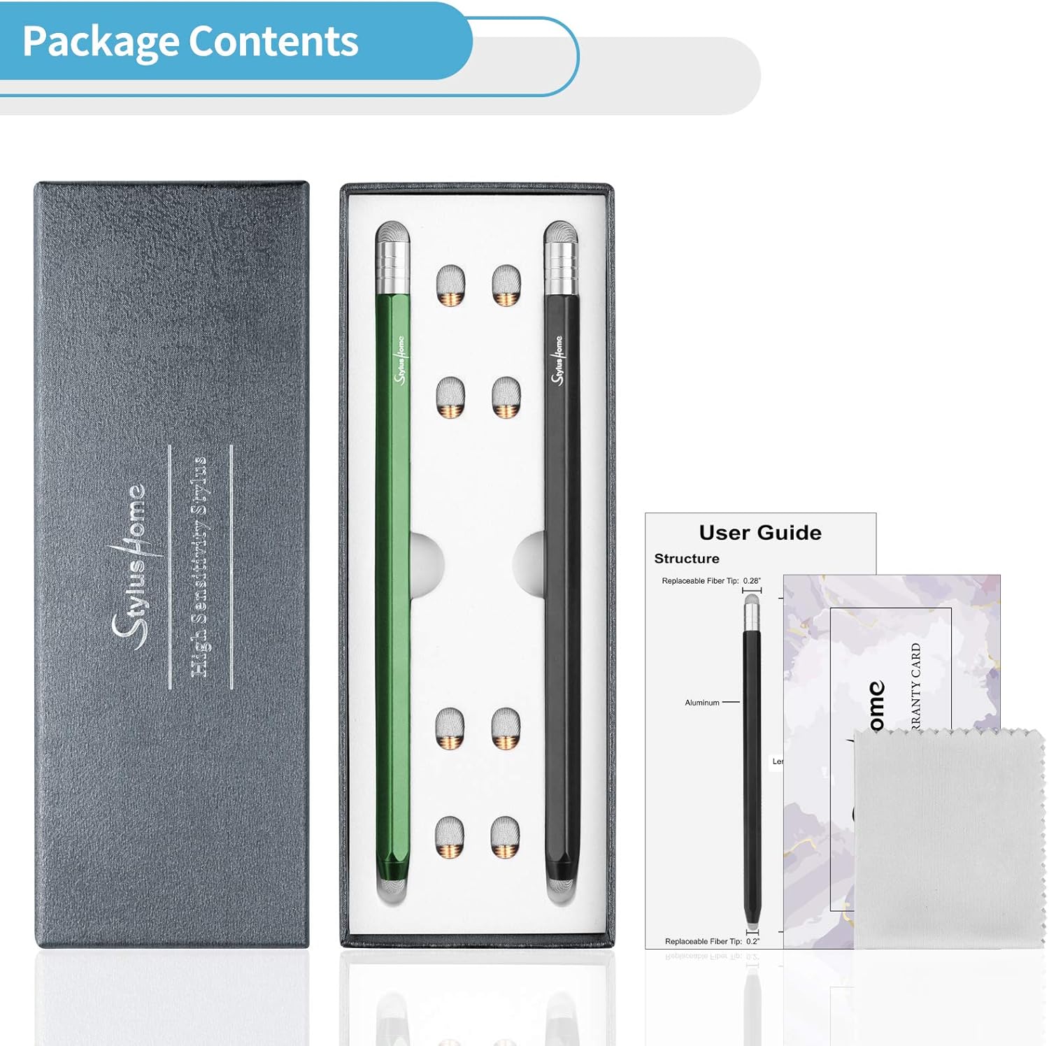 StylusHome Stylus for Touch Screens (2 Pcs), High Sensitivity 2 in 1 Fiber Tips Pen with 8 Extra Replaceable Tips, Stylus for iPad iPhone Tablets Samsung All Universal Touch Screen (Black & Green)