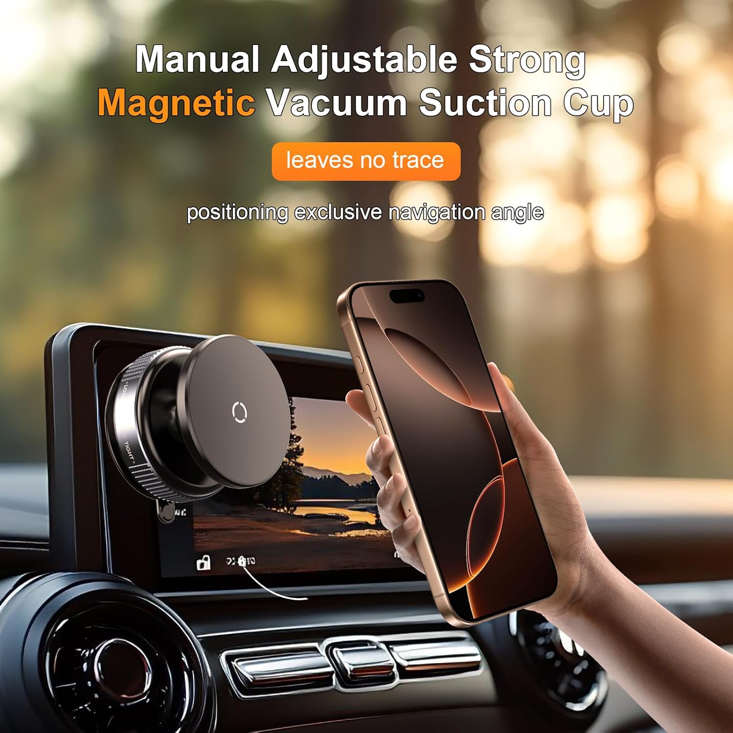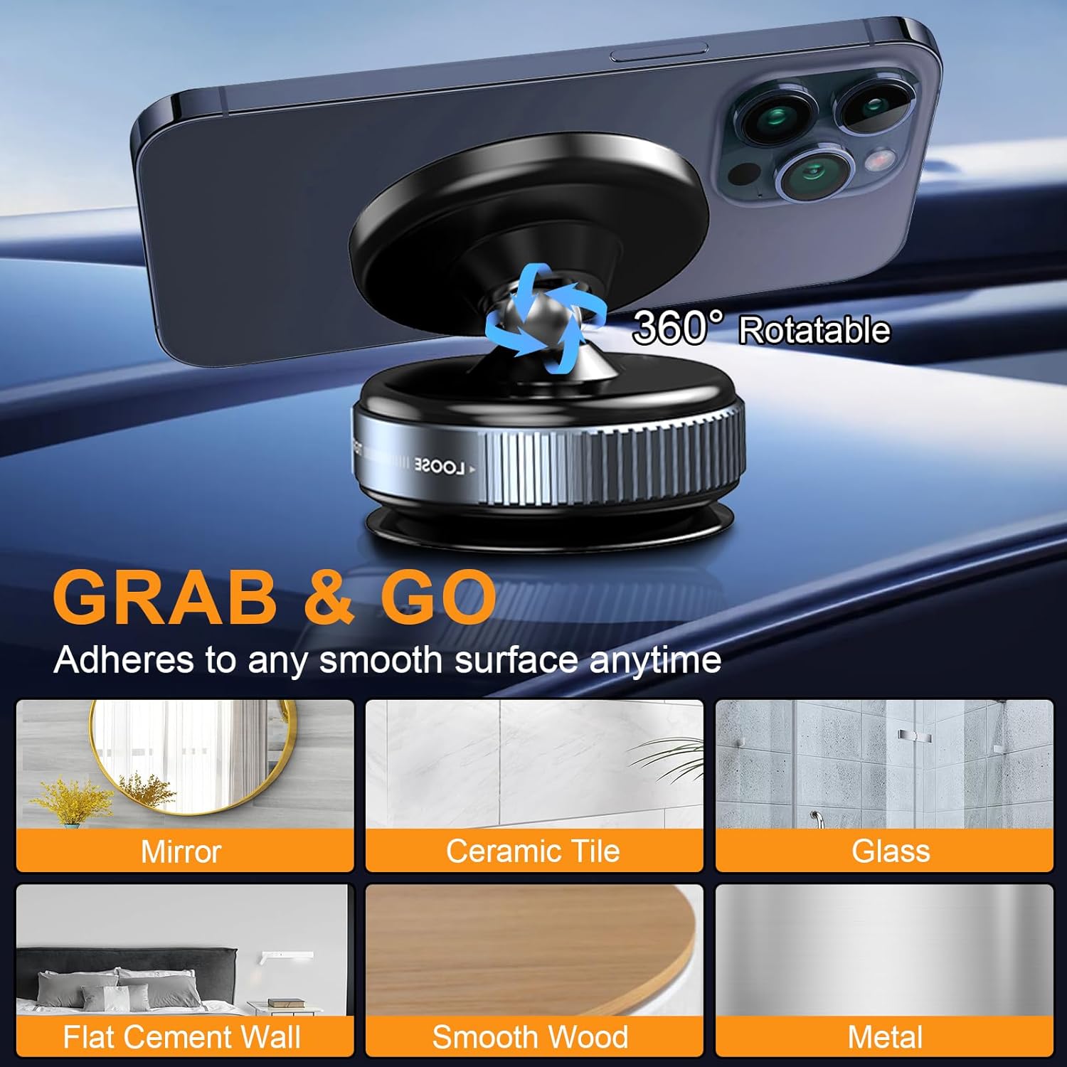 【Powerful Magnetic Absorption Design】Mechanical vacuum suction phone mount built in N52 strong magnet on the front can generate strong attraction and easily Suction your phone or phone with magnetic case in less than 1 second. It can ensure your phone will not fall off on bumpy, sharp turns, speed bumps, and other road surfaces, making your travel safer.