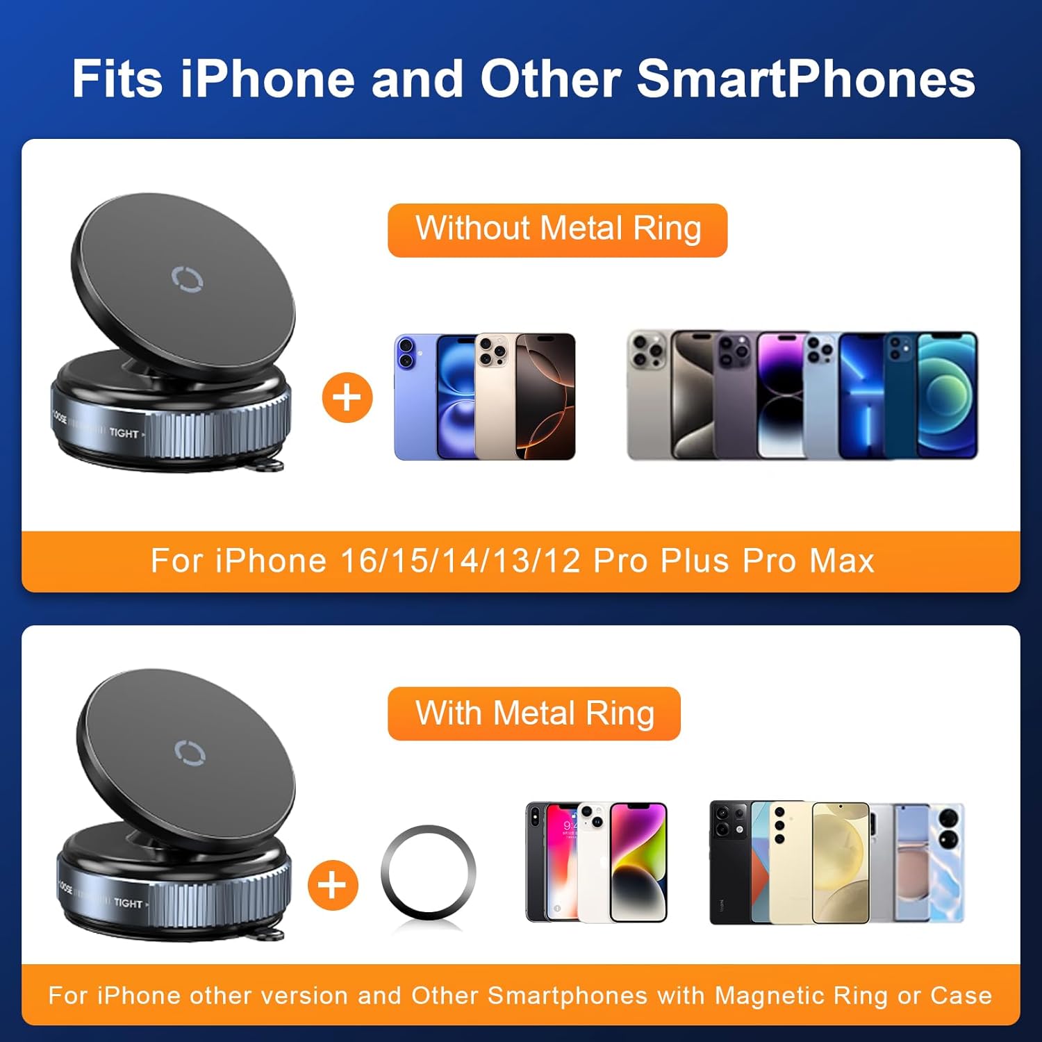 【Wide Compatibility】The vacuum suction phone holder can be used directly on iPhone 16/15/14/13/12 Plus Pro Pro Max-series and any phone(like Samsung,Motorla,Google) with magnetic case. In addition, we offer metal rings for non-magnetic phones and phone cases. Glue the metal ring to the back of the phone or phone case and let it sit for 24 hours to maximize adhesion.